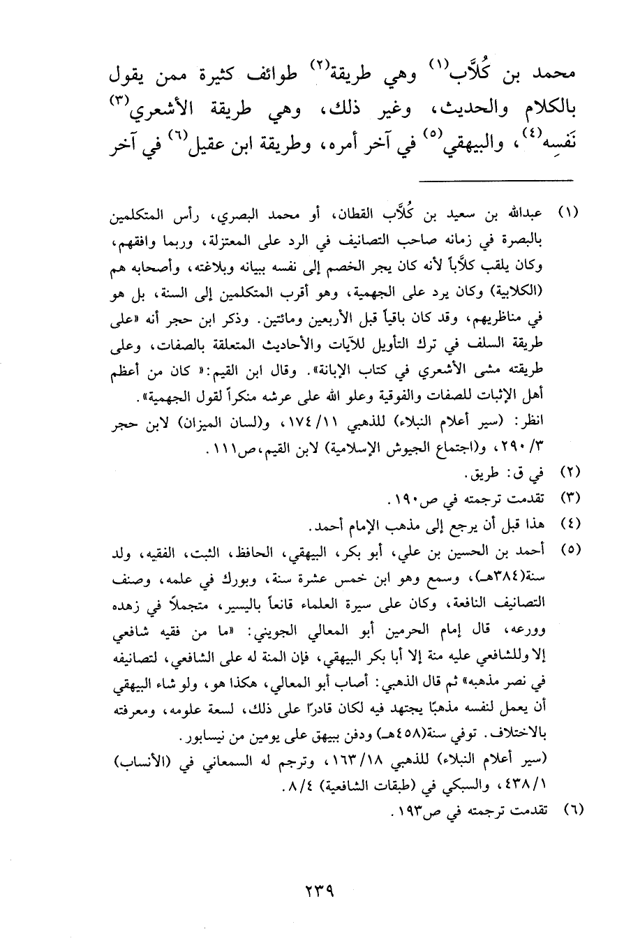 محمد بن كُلاَّب وهي طريقة طوائف كثيرة ممن يقول بالكلام والحديث وغير ذلك وهي طريقة الشعري نَفسِه والبيهقي في آخر أمره وطريقة ابن عقيل في آخر