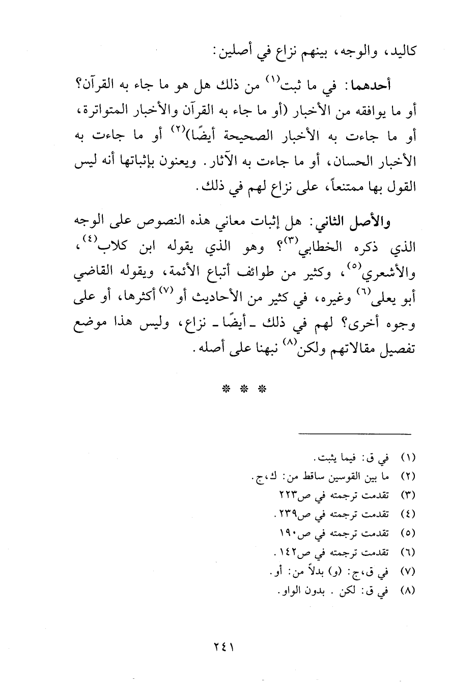 كاليد والوجه بينهم نزاع في أصلين أحدهما فيما ثبت من ذلك هل هو ما جاء به القرآن أو ما يوافقه من الأخبار أو ما جاء به القرآن والأخبار المتواترة أو ما جاءت به الأخبار الصحيحة أيضًا أو ما جاءت به الأخبار الحسان أو ما جاءت به الآثار ويعنون بإثباتها أنه ليس القول بها ممتنعًا على نزاع لهم في ذلك والأصل الثاني هل إثبات معاني هذه النصوص على الوجه الذي ذكره الخطابي وهو الذي يقوله ابن كلاب والأشعري وكثير من طوائف أتباع الأئمة ويقوله القاضي أبو يعلى وغيره في كثير من الأحاديث أو أكثرها أو على وجوه أخرى لهم في ذلك أيضًا نزاع وليس هذا موضع تفصيل مقالاتهم ولكن نبهنا على أصله