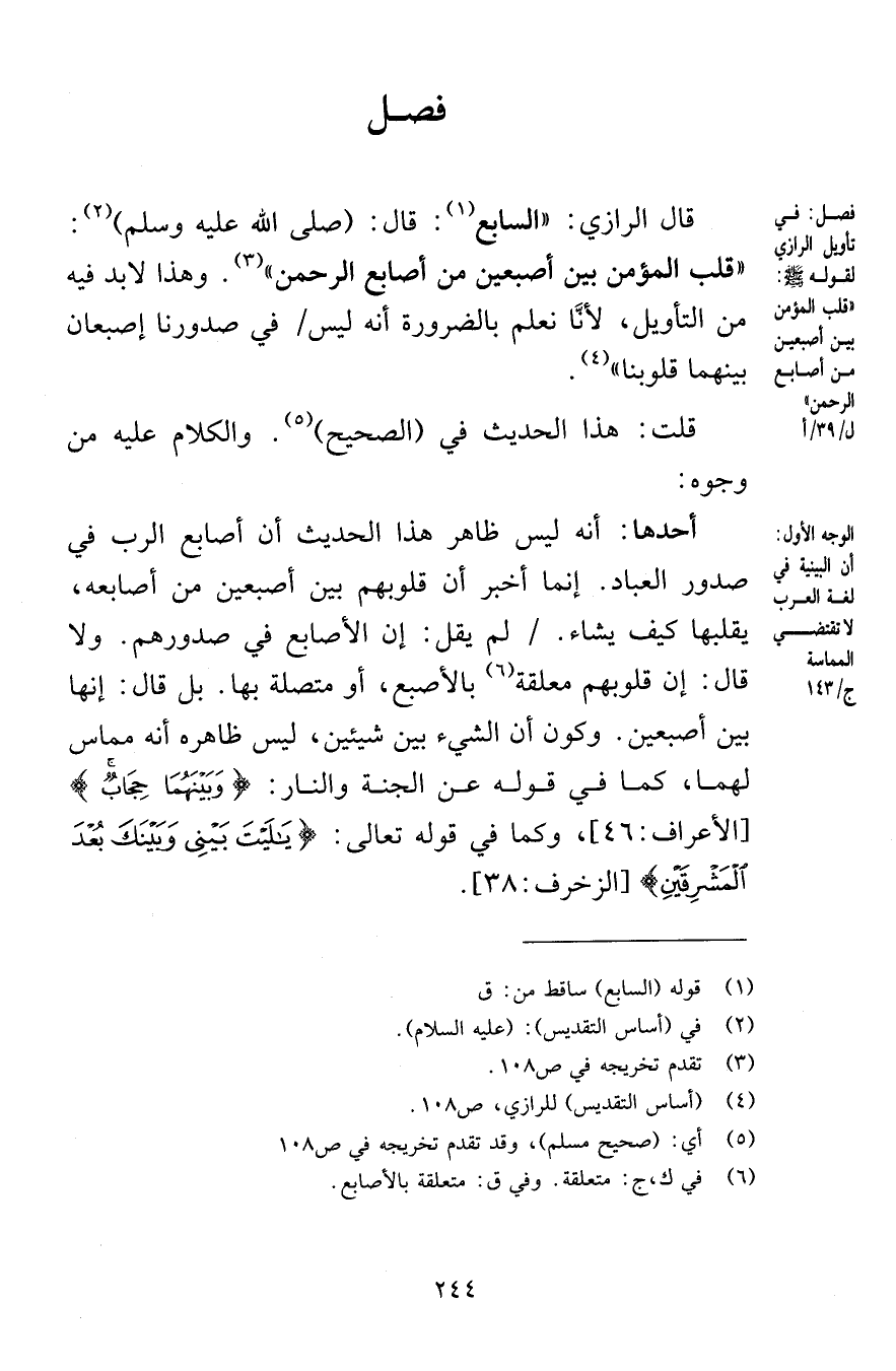 فصل قال الرازي السابع قال صلى الله عليه وسلم قلب المؤمن بين أصبعين من أصابع الرحمن وهذا لابد فيه من التأويل لأنَّا نعلم بالضرورة أنه ليس في صدورنا إصبعان بينهما قلوبنا قلت هذا الحديث في الصحيح والكلام عليه من وجوه أحدها أنه ليس ظاهر هذا الحديث أن أصابع الرب في صدور العباد إنما أخبر أن قلوبهم بين أصبعين من أصابعه يقلبها كيف يشاء لم يقل إن الأصابع في صدورهم ولا قال إن قلوبهم معلقة بالأصبع أو متصلة بها بل قال إنها بين أصبعين وكون أن الشيء بين شيئين ليس ظاهره أنه مماس لهما كما في قوله عن الجنة والنار وَبَيْنَهُمَا حِجَابٌ [الأعراف 46] وكما في قوله تعالى يَا لَيْتَ بَيْنِي وَبَيْنَكَ بُعْدَ الْمَشْرِقَيْنِ [الزخرف 38]