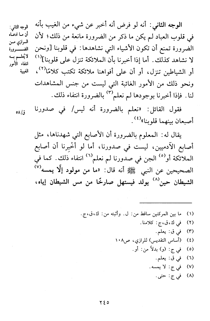 الوجه الثاني أنه لو فرض أنه أخبر عن شيء من الغيب بأنه في قلوب العباد لم يكن ما ذكر من الضرورة مانعة من ذلك لأن الضرورة تمنع أن تكون الأشياء التي نشاهدها في قلوبنا ونحن لا نشاهد كذلك أما إذا أخبرنا بأن الملائكة تنزل على قلوبنا أو الشياطين تنزل أو أن على أفواهنا ملائكة تكتب كلامًا ونحو ذلك من الأمور الغائبة التي ليست من جنس المشاهدات لنا فإذا أخبرنا بوجودها لم نعلم بالضرورة انتفاء ذلك فقول القائل نعلم بالضرورة أنه ليس في صدورنا أصبعان بينهما قلوبنا يقال له المعلوم بالضرورة أن الأصابع التي شهدناها مثل أصابع الآدميين ليست في صدورنا أما لو أخْبِرنا أن أصابع الملائكة أو الجن في صدورنا لم نعلم انتفاء ذلك كما في الصحيحين عن النبي صلى الله عليه وسلم أنه قال ما من مولود إلاّ يمسه الشيطان حين يولد فيستهل صارخًا من مس الشيطان إياه