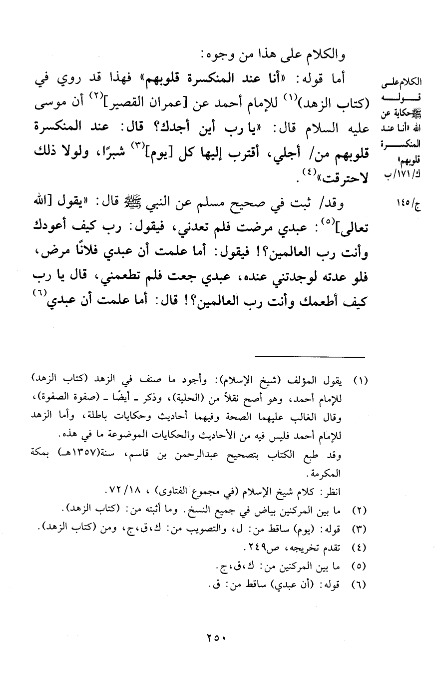 والكلام على هذا من وجوه أما قوله أنا عند المنكسرة قلوبهم فهذا قد روي في كتاب الزهد للإمام أحمد عن عمران القصير أن موسى عليه السلام قال يا رب أين أجدك قال عند المنكسرة قلوبهم من أجلي أقترب إليها كل يوم شبرًا ولولا ذلك لاحترقت وقد ثبت في صحيح مسلم عن النبي صلى الله عليه وسلم قال يقول الله تعالى عبدي مرضت فلم تعدني فيقول رب كيف أعودك وأنت رب العالمين فيقول أما علمت أن عبدي فلانًا مرض فلو عدته لوجدتني عنده عبدي جعت فلم تطعمني قال يا رب كيف أطعمك وأنت رب العالمين قال أما علمت أن عبدي