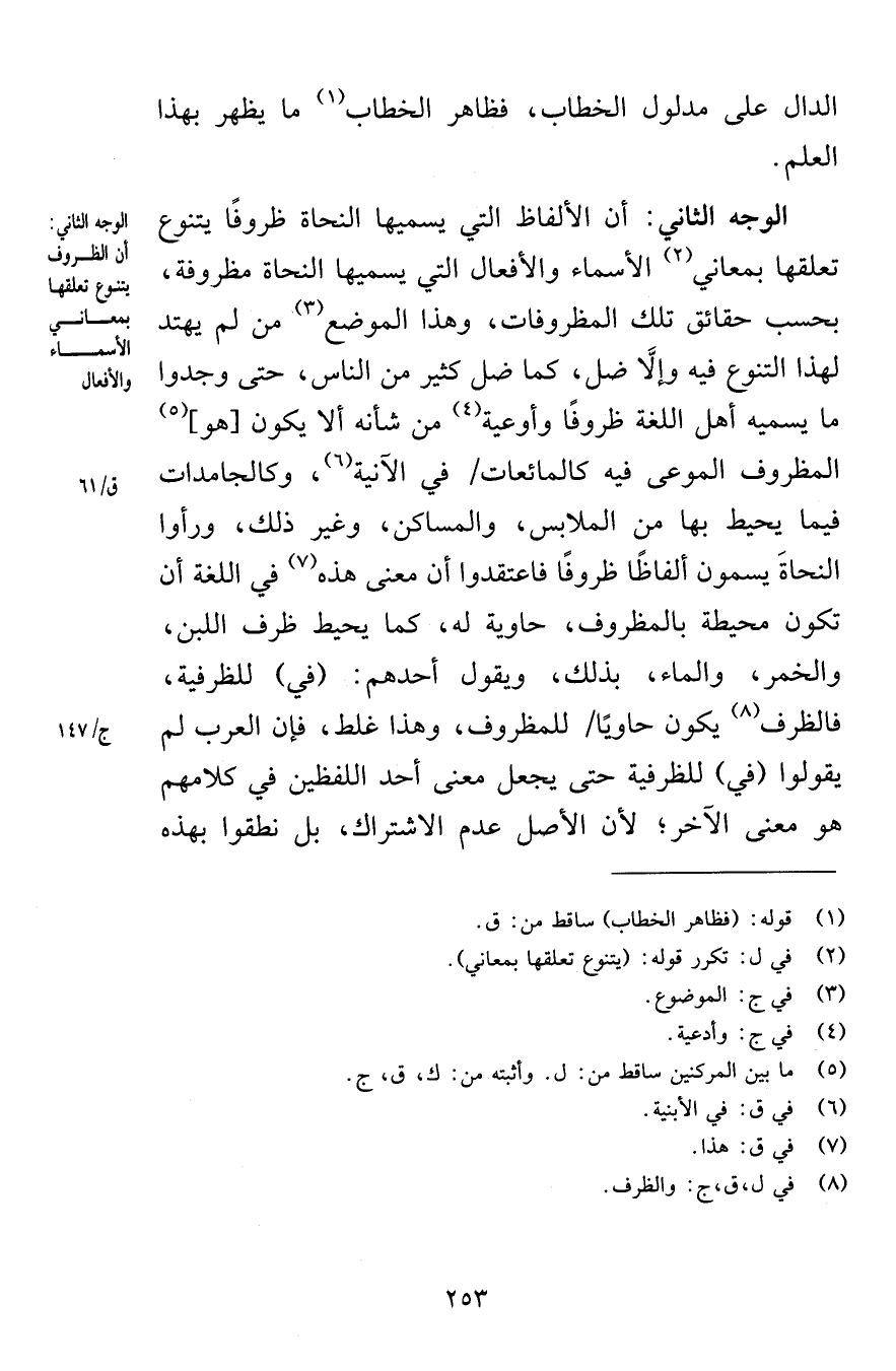 الدال على مدلول الخطاب فظاهر الخطاب ما يظهر بهذا العلم الوجه الثاني أن الألفاظ التي يسميها النحاة ظروفًا يتنوع تعلقها بمعاني الأسماء والأفعال التي يسميها النحاة مظروفة بحسب حقائق تلك المظروفات وهذا الموضع من لم يهتد لهذا التنوع فيه وإلاَّ ضل كما ضل كثير من الناس حتى وجدوا ما يسميه أهل اللغة ظروفًا وأوعية من شأنه ألا يكون هو المظروف الموعى فيه كالمائعات في الآنية وكالجامدات فيما يحيط بها من الملابس والمساكن وغير ذلك ورأوا النحاةَ يسمون ألفاظًا ظروفًا فاعتقدوا أن معنى هذه في اللغة أن تكون محيطة بالمظروف حاوية له كما يحيط ظرف اللبن والخمر والماء بذلك ويقول أحدهم في للظرفية فالظرف يكون حاويًا للمظروف وهذا غلط فإن العرب لم يقولوا في للظرفية حتى يجعل معنى أحد اللفظين في كلامهم هو معنى الآخر لأن الأصل عدم الاشتراك بل نطقوا بهذه