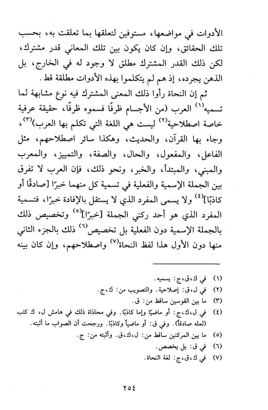 الأدوات في مواضعها مستوفين لتعلقها بما تعلقت به بحسب تلك الحقائق وإن كان يكون بين تلك المعاني قدر مشترك لكن ذلك القدر المشترك مطلق لا وجود له في الخارج بل الذهن يجرده إذ هم لم يتكلموا بهذه الأدوات مطلقة قط ثم إن النحاة رأوا ذلك المعنى المشترك فيه نوع مشابهة لما تسميه العرب من الأجسام ظرفًا فسموه ظرفًا حقيقة عرفية خاصة اصطلاحية ليست هي اللغة التي تكلم بها العرب وجاء بها القرآن والحديث وهكذا سائر اصطلاحهم مثل الفاعل والمفعول والحال والصفة والتمييز والمعرب والمبني والمبتدأ والخبر ونحو ذلك فإن العرب لا تفرق بين الجملة الإسمية والفعلية في تسمية كل منهما خبرًا صادقًا أو كاذبًا ولا يسمى المفرد الذي لا يستقل بالإفادة خبرًا فتسمية المفرد الذي هو أحد ركني الجملة خبرًا وتخصيص ذلك بالجملة الإسمية دون الفعلية بل تخصيص ذلك بالجزء الثاني منها دون الأول هذا لفظ النحاة واصطلاحهم وإن كان بينه