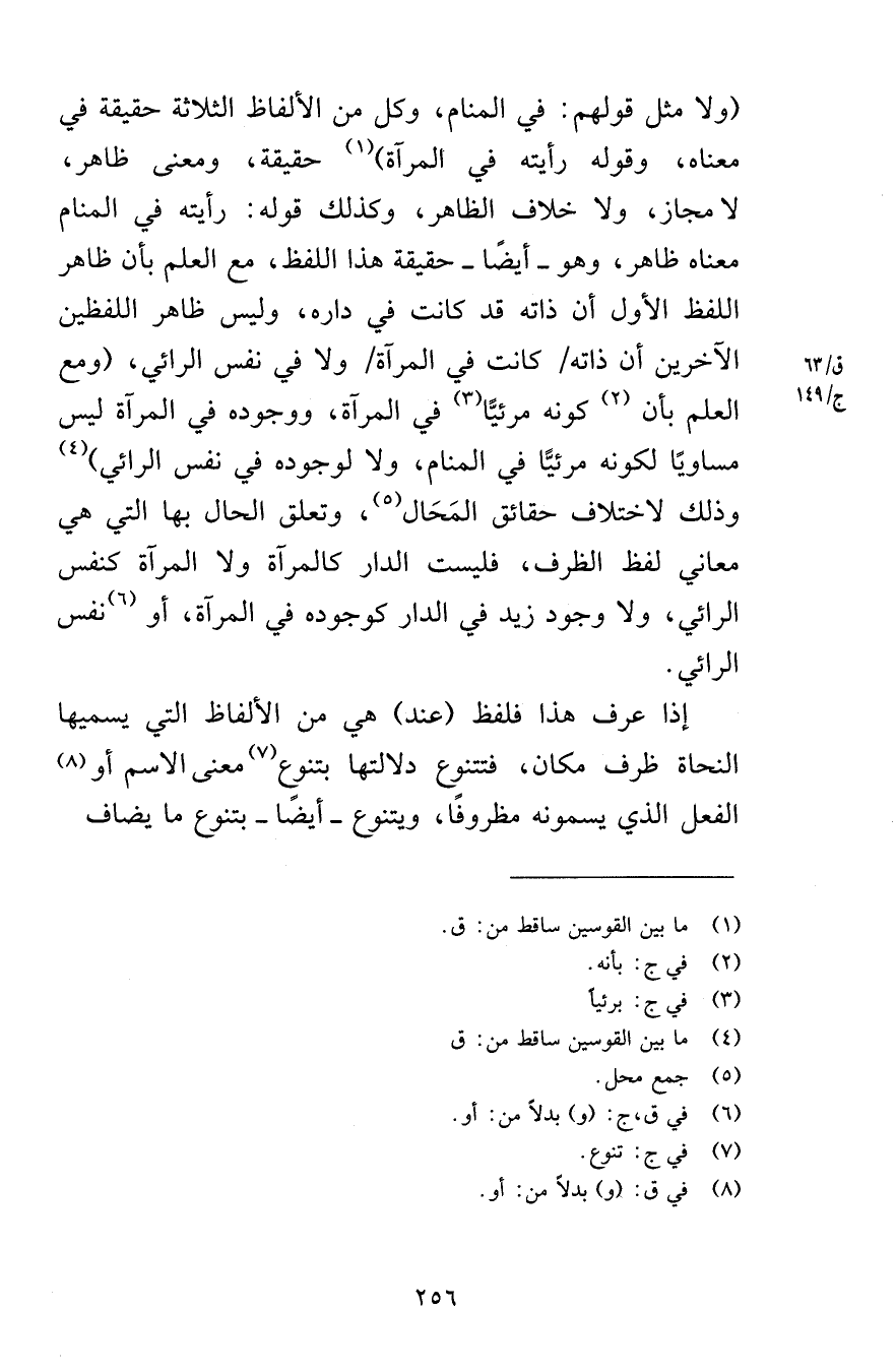 ولا مثل قولهم في المنام وكل من الألفاظ الثلاثة حقيقة في معناه وقوله رأيته في المرآة حقيقة ومعنى ظاهر لا مجاز ولا خلاف الظاهر وكذلك قوله رأيته في المنام معناه ظاهر وهو أيضًا حقيقة هذا اللفظ مع العلم بأن ظاهر اللفظ الأول أن ذاته قد كانت في داره وليس ظاهر اللفظين الآخرين أن ذاته كانت في المرآة ولا في نفس الرائي ومع العلم بأن كونه مرئيًّا في المرآة ووجوده في المرآة ليس مساويًا لكونه مرئيًّا في المنام ولا لوجوده في نفس الرائي وذلك لاختلاف حقائق المَحَال وتعلق الحال بها التي هي معاني اللفظ لظرف فليس الدار كالمرآة ولا المرآة كنفس الرائي ولا وجود زيد في الدار كوجوده في المرآة أو في نفس الرائي إذا عرف هذا فلفظ عند هي من الألفاظ التي يسميها النحاة ظرف مكان فتتنوع دلالتها بتنوع معنى الاسم أو الفعل الذي يسمونه مظروفًا ويتنوع أيضًا بتنوع ما يضاف