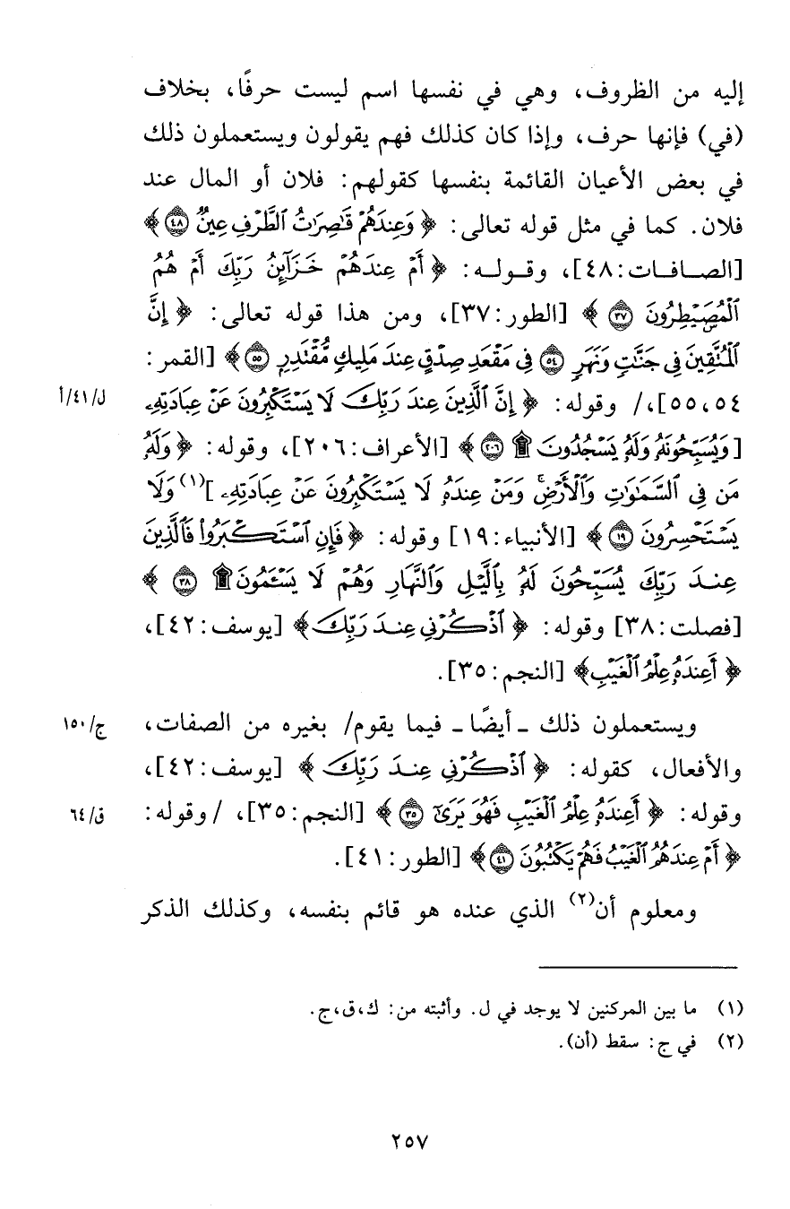 إليه من الظرف وهي في نفسها اسم ليست حرفًا بخلاف في فإنها حرف وإذا كان كذلك فهم يقولون ويستعملون ذلك في بعض الأعيان القائمة بنفسها كقولهم فلان أو المال عند فلان كما في مثل قوله تعالى وَعِنْدَهُمْ قَاصِرَاتُ الطَّرْفِ عِينٌ (48) [الصافات 48] وقوله أَمْ عِنْدَهُمْ خَزَائِنُ رَبِّكَ أَمْ هُمُ الْمُصَيْطِرُونَ (37) [الطور 37] ومن هذا قوله تعالى إِنَّ الْمُتَّقِينَ فِي جَنَّاتٍ وَنَهَرٍ (54) فِي مَقْعَدِ صِدْقٍ عِنْدَ مَلِيكٍ مُقْتَدِرٍ (55) [القمر 54-55] وقوله إِنَّ الَّذِينَ عِنْدَ رَبِّكَ لَا يَسْتَكْبِرُونَ عَنْ عِبَادَتِهِ وَيُسَبِّحُونَهُ وَلَهُ يَسْجُدُونَ (206) [الأعراف 206] وقوله وَلَهُ مَنْ فِي السَّمَاوَاتِ وَالْأَرْضِ وَمَنْ عِنْدَهُ لَا يَسْتَكْبِرُونَ عَنْ عِبَادَتِهِ وَلَا يَسْتَحْسِرُونَ (19) [الأنبياء 19] وقوله فَإِنِ اسْتَكْبَرُوا فَالَّذِينَ عِنْدَ رَبِّكَ يُسَبِّحُونَ لَهُ بِاللَّيْلِ وَالنَّهَارِ وَهُمْ لَا يَسْأَمُونَ (38) [فصلت 38] وقوله اذْكُرْنِي عِنْدَ رَبِّكَ [يوسف 42] أَعِنْدَهُ عِلْمُ الْغَيْبِ [النجم 35] ويستعملون ذلك أيضًا فيما يقوم بغيره من الصفات والأفعال كقوله اذْكُرْنِي عِنْدَ رَبِّكَ [يوسف 42] وقوله أَعِنْدَهُ عِلْمُ الْغَيْبِ فَهُوَ يَرَى (35) [النجم 35] وقوله أَمْ عِنْدَهُمُ الْغَيْبُ فَهُمْ يَكْتُبُونَ (41) [الطور 41] ومعلوم أن الذي عنده هو قائم بنفسه وكذلك الذكر