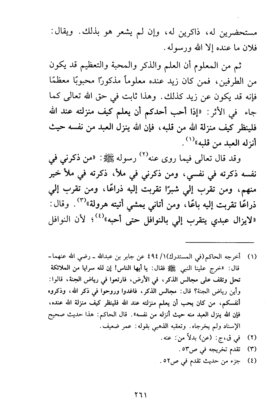 مستحضرين له ذاكرين له وإن لم يشعر هو بذلك ويقال فلان ما عنده إلا الله ورسوله ثم من المعلوم أن العلم والذكر والمحبة والتعظيم قد يكون من الطرفين فمن كان زيد عنده معلوماً مذكورًا محبوبًا معظمًا فإنه قد يكون عند زيد كذلك وهذا ثابت في حق الله تعالى كما جاء في الأثر إذا أحب أحدكم أن يعلم كيف منزلته عند الله فلينظر كيف منزلة الله في قلبه فإن الله ينزل العبد من نفسه حيث أنزله العبد من قلبه وقد قال تعالى فيما روى عنه رسوله صلى الله عليه وسلم من ذكرني في نفسه ذكرته في نفسي ومن ذكرني في ملأ ذكرته في ملأ خير منهم ومن تقرب إلي شبرًا تقربت إليه ذراعًا ومن تقرب إلي ذراعًا تقربت إليه باعًا ومن أتاني يمشي أتيته هرولة وقال لايزال عبدي يتقرب إلي بالنوافل حتى أحبه لأن النوافل
