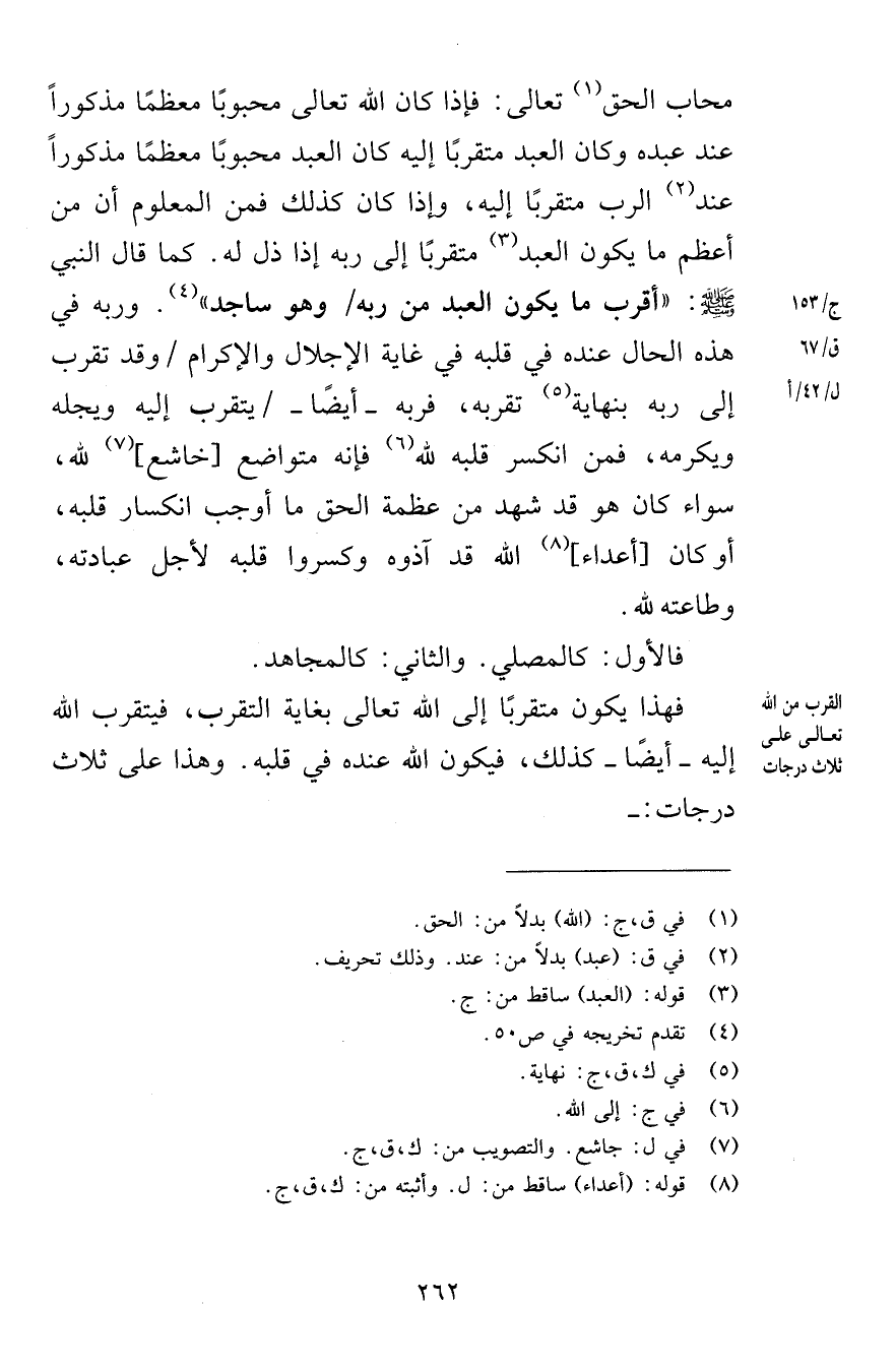محاب الحق تعالى فإذا كان الله تعالى محبوبًا معظمًا مذكورًا عند عبده وكان العبد متقربًا إليه كان العبد محبوبًا معظمًا مذكورًا عند الرب متقربًا إليه وإذا كان كذلك فمن المعلوم أن من أعظم ما يكون العبد متقربًا إلى ربه إذا ذل له كما قال النبي صلى الله عليه وسلم أقرب ما يكون العبد من ربه وهو ساجد وربه في هذه الحال عنده في قلبه في غاية الإجلال والإكرام وقد تقرب إلى ربه بنهاية تقربه فربه أيضًا يتقرب إليه ويجله ويكرمه فمن انكسر قلبه لله فإنه متواضع خاشع لله سواء كان هو قد شهد من عظمة الحق ما أوجب انكسار قلبه أو كان أعداء الله قد آذوه وكسروا قلبه لأجل عبادته وطاعته لله فالأول كالمصلي والثاني كالمجاهد فهذا يكون متقربًا إلى الله تعالى بغاية التقرب فيتقرب الله إليه أيضًا كذلك فيكون الله عنده في قلبه وهذا على ثلاث درجات