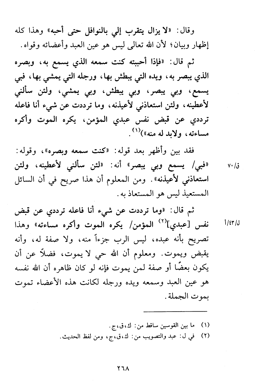 وقال لا يزال عبدي يتقرب إلي بالنوافل حتى أحبه وهذا كله إظهار وبيان لأن الله تعالى ليس هو عين العبد وأعضائه وقواه ثم قال فإذا أحببته كنت سمعه الذي يسمع به وبصره الذي يبصر به ويده التي يبطش بها ورجله التي يمشي بها فبي يسمع وبي يبصر وبي يبطش وبي يمشي ولئن سألني لأعطينه ولئن استعاذني لأعيذنه وما ترددت عن شيء أنا فاعله كترددي عن قبض نفس عبدي المؤمن يكره الموت وأكره مساءته ولابد له منه فقد بين واظهر بعد قوله كنت سمعه وبصره وقوله فبي يسمع وبي يبصر أنه لئن سألني لأعطينه ولئن استعاذني لأعيذنه ومن المعلوم أن هذا صريه في أن السائل المستعيذ ليس هو المستعاذ به ثم قال وما ترددت عن شيء أنا فاعله ترددي عن قبض نقس عبدي المؤمن يكره الموت وأكره مساءته وهذا تصريح بأنه عبده ليس الرب جزءاً منه ولا صفة له وأنه يقبض ويموت ومعلوم أن الله حي لا يموت فضلاً عن أن يكون بعضًا أو صفة لمن يموت فإنه لو كان ظاهره أن الله نفسه هو عين العبد وسمعه ويده ورجله لكانت هذه الأعضاء تموت بموت الجملة