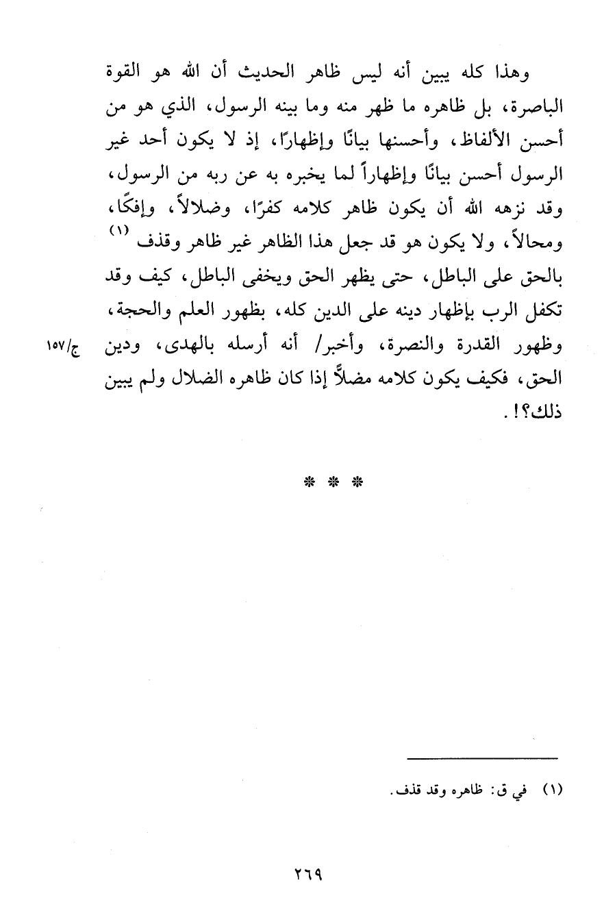 وهذا كله يبين أنه ليس ظاهر الحديث أن الله هو القوة الباصرة بل ظاهره ما ظهر منه وما بينه الرسول الذي هو من أحسن الألفاظ وأحسنها بيانًا وإظهارًا إذ لا يكون أحد غير الرسول أحسن بيانًا وإظهاراً لما يخبره به عن ربه من الرسول وقد نزهه الله أن يكون ظاهر كلامه كفرًا وضلالاً وإفكًا ومحالاً ولا يكون هو قد جعل هذا الظاهر غير ظاهر وقذف بالحق على الباطل حتى يظهر الحق ويخفى الباطل كيف وقد تكفل الرب بإظهار دينه على الدين كله بظهور العلم والحجة وظهور القدرة والنصرة وأخبر أنه أرسله بالهدى ودين الحق فكيف يكون كلامه مضلاًّ إذا كان ظاهره الضلال ولم يبين ذلك