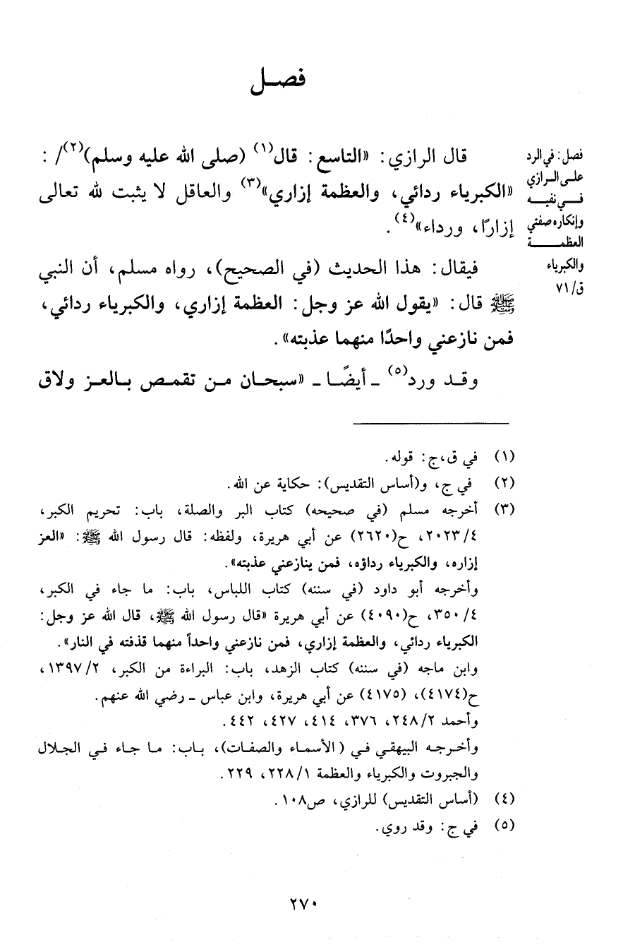فصل قال الرازي الوجه التاسع قال صلى الله عليه وسلم الكبرياء ردائي والعظمة إزاري والعاقل لا يثبت لله تعالى إزارًا ورداء فيقال هذا الحديث في الصحيح رواه مسلم أن النبي صلى الله عليه وسلم قال يقول الله عز وجل العظمة إزاري والكبرياء ردائي فمن نازعني واحدًا منهما عذبته وقد ورد أيضًا سبحان من تقمص بالعز ولاق