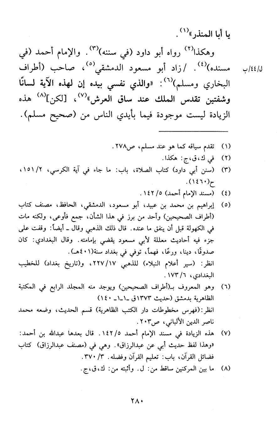 يا أبا المنذر وهكذا رواه أبو داود في سننه والإمام أحمد في مسنده زاد أبو مسعود الدمشقي صاحب أطراف البخاري ومسلم والذي نفسي بيده إن لهذه الآية لسانًا وشفتين تقدس الملك عند ساق العرش لكن هذه الزيادة ليست موجودة فيما بأيدي الناس من صحيح مسلم