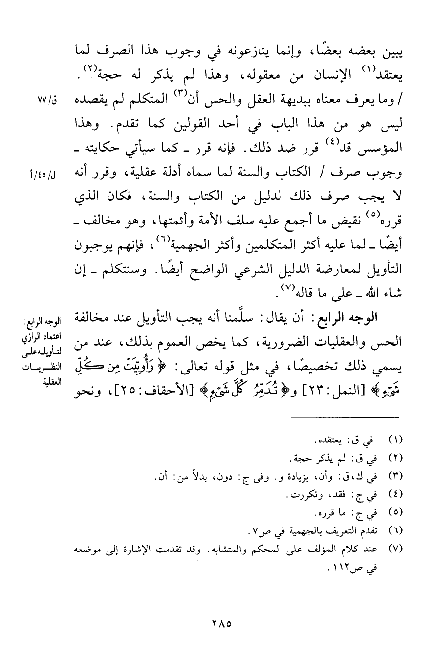يبين بعضه بعضًا وإنما ينازعونه في وجوب هذا الصرف لما يعتقد الإنسان من معقوله وهذا لم يذكر له حجة وما يعرف معناه ببديهة العقل والحس أن المتكلم لم يقصده ليس هو من هذا الباب في أحد القولين كما تقدم وهذا المؤسس قد قرر ضد ذلك فإنه قرر كما سيأتي حكايته وجوب صرف الكتاب والسنة لما سماه أدلة عقلية وقرر أنه لا يجب صرف ذلك لدليل من الكتاب والسنة فكان الذي قرره نقيض ما أجمع عليه سلف الأمة وأئمتها وهو مخالف أيضًا لما عليه أكثر المتكلمين وأكثر الجهمية فإنهم يوجبون التأويل لمعارضة الدليل الشرعي الواضح أيضًا وسنتكلم إن شاء الله على ما قاله الوجه الرابع أن يقال سلَّمنا أنه يجب التأويل عند مخالفة الحس والعقليات الضرورية كما يخص العموم بذلك عند من يسمي ذلك تخصيصًا في مثل قوله تعالى وَأُوتِيَتْ مِنْ كُلِّ شَيْءٍ [النمل 23] وتُدَمِّرُ كُلَّ شَيْءٍ [الأحقاف 25] ونحو