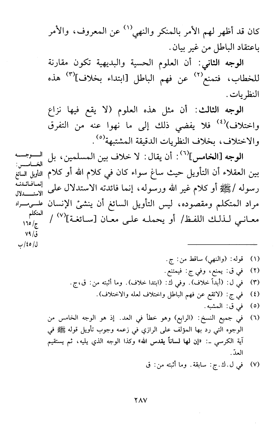 كان قد أظهر لهم الأمر بالمنكر والنهي عن المعروف والأمر باعتقاد الباطل من غير بيان الوجه الثاني أن العلوم الحسية والبديهية تكون مقارنة للخطاب فتمنع عن فهم الباطل ابتداء بخلاف هذه النظريات الوجه الثالث أن مثل هذه العلوم لا يقع فيها نزاع واختلاف فلا يفضي ذلك إلى ما نهوا عنه من التفرق والاختلاف بخلاف النظريات الدقيقة المشتبهة الوجه الخامس أن يقال لا خلاف بين المسلمين بل بين العقلاء أن التأويل حيث ساغ سواء كان في كلام الله أو كلام رسوله صلى الله عليه وسلم أو كلام غير الله ورسوله إنما فائدته الاستدلال على مراد المتكلم ومقصوده ليس التأويل السائغ أن ينشئ الإنسان معاني لذلك اللفظ أو يحمله على معاني سائغة