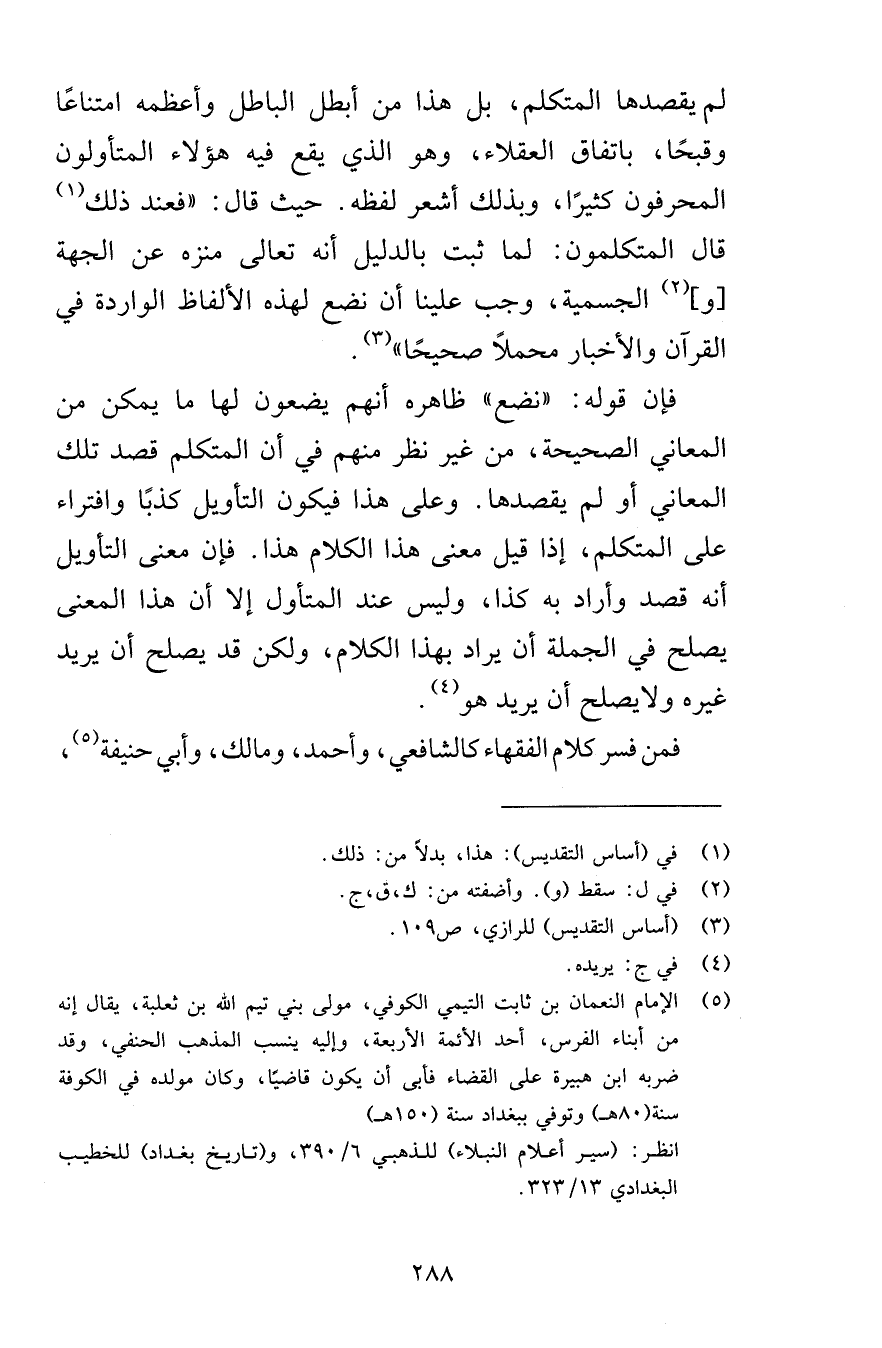 لم يقصدها المتكلم بل هذا من أبطل الباطل وأعظمه امتناعًا وقبحًا باتفاق العقلاء وهو الذي يقع فيه هؤلاء المتأولون المحرفون كثيرًا وبذلك أشعر لفظه حيث قال فعند ذلك قال المتكلمون لما ثبت بالدليل أنه تعالى منزه عن الجهة والجسمية وجب علينا أن نضع لهذه الألفاظ الواردة في القرآن والأخبار محملاً صحيحًا فإن قوله نضع ظاهره أنهم يضعون لها ما يمكن من المعاني الصحيحة من غير نظر منهم في أن المتكلم قصد تلك المعاني أو لم يقصدها وعلى هذا فيكون التأويل كذبًا وافتراء على المتكلم إذا قيل معنى هذا الكلام هذا فإن معنى التأويل أنه قصد وأراد به كذا وليس عند المتأول إلا أن هذا المعنى يصلح في الجملة أن يراد بهذا الكلام ولكن قد يصلح أن يريد غيره ولا يصلح أن يريد هو فمن فسر كلام الفقهاء كالشافعي وأحمد ومالك وأبي حنيفة