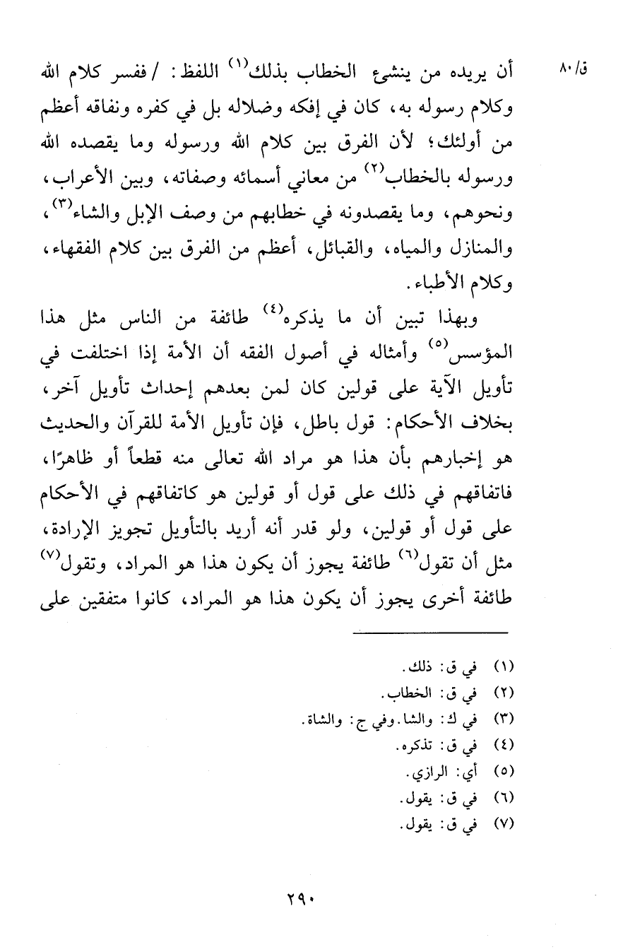 أن يريده من ينشئ الخطاب بذلك اللفظ ففسر كلام الله وكلام رسوله به كان في إفكه وضلاله بل في كفره ونفاقه أعظم من أولئك لأن الفرق بين كلام الله ورسوله وما يقصده الله ورسوله بالخطاب من معاني أسمائه وصفاته وبين الأعراب ونحوهم وما يقصدونه في خطابهم من وصف الإبل والشاء والمنازل والمياه والقبائل أعظم من الفرق بين كلام الفقهاء وكلام الأطباء وبهذا تبين أن ما يذكره طائفة من الناس مثل هذا المؤسس وأمثاله في أصول الفقه أن الأمة إذا اختلفت في تأويل الآية على قولين كان لمن بعدهم إحداث تأويل آخر بخلاف الأحكام قول باطل فإن تأويل الأمة للقرآن والحديث هو إخبارهم بأن هذا هو مراد الله تعالى منه قطعاً أو ظاهرًا فاتفاقهم في ذلك على قول أو قولين هو كاتفاقهم في الأحكام على قول أو قولين ولو قدر أنه أريد بالتأويل تجويز الإرادة مثل أن تقول طائفة يجوز أن يكون هذا هو المراد وتقول طائفة أخرى يجوز أن يكون هذا هو المراد كانوا متفقين على