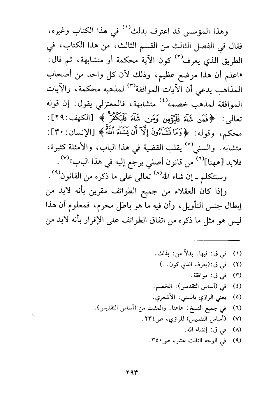 وهذا المؤسس قد اعترف بذلك في هذا الكتاب وغيره فقال في الفصل الثالث من القسم الثالث من هذا الكتاب في الطريق الذي يعرف كون الآية محكمة أو متشابهة ثم قال اعلم أن هذا موضع عظيم وذلك لأن كل واحد من أصحاب المذاهب يدعي أن الآيات الموافقة لمذهبه محكمة والآيات الموافقة لمذهب خصمه متشابهة فالمعتزلي يقول إن قوله تعالى فَمَنْ شَاءَ فَلْيُؤْمِنْ وَمَنْ شَاءَ فَلْيَكْفُرْ [الكهف 29] محكم وقوله وَمَا تَشَاءُونَ إِلَّا أَنْ يَشَاءَ اللَّهُ [الإنسان 30] متشابه والسني يقلب القضية في هذا الباب والأمثلة كثيرة فلابد ههنا من قانون أصلي يرجع إليه في هذا الباب وسنتكلم إن شاء الله تعالى على ما ذكره من القانون وإذا كان العقلاء من جميع الطوائف مقرين بأنه لابد من إبطال جنس التأويل وأن فيه ما هو باطل محرم فمعلوم أن هذا ليس هو مثل ما ذكره من اتفاق الطوائف على الإقرار بأنه لابد من