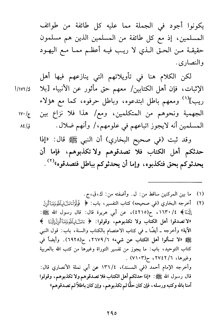 يكونوا أجود في الجملة مما هو عليه كل طائفة من طوائف المسلمين إذ مع كل طائفة من المسلمين الذين هم مسلمون حقيقة من الحق الذي لا ريب فيه أعظم مما مع اليهود والنصارى لكن الكلام هنا في تأويلاتهم التي ينازعهم فيها أهل الإثبات فإن أهل الكتابين معهم حق مأثور عن الأنبياء بلا ريب ومعهم باطل ابتدعوه وباطل حرفوه كما مع هؤلاء الجهمية ونحوهم من المتكلمين ومع هذا فلا نزاع بين المسلمين أنه لا يجوز اتباعهم في علومهم وأنهم ضلال وقد ثبت في صحيح البخاري أن النبي صلى الله عليه وسلم قال إذا حدثكم أهل الكتاب فلا تصدقوهم ولا تكذبوهم فإما أن يحدثوكم بحق فتكذبوه وإما أن يحدثوكم بباطل فتصدقوه