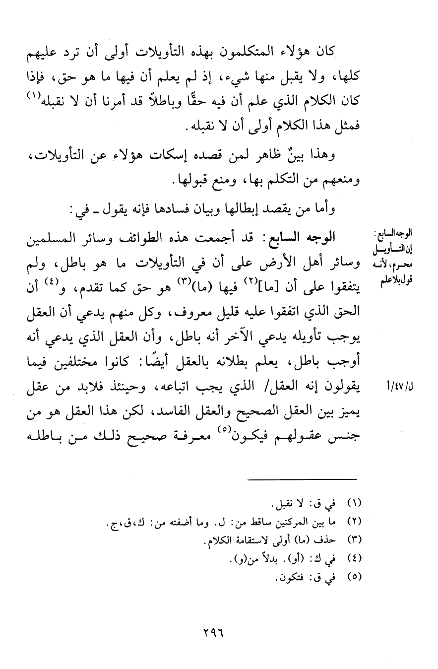 كان هؤلاء المتكلمون بهذه التأويلات أولى أن ترد عليهم كلها ولا يقبل منها شيء إذ لم يعلم أن فيها ما هو حق فإذا كان الكلام الذي علم أن فيه حقًّا وباطلاً قد أمرنا أن لا نقبله فمثل هذا الكلام أولى أن لا نقبله وهذا بينٌ ظاهر لمن قصده إسكات هؤلاء عن التأويلات ومنعهم من التكلم بها ومنع قبولها وأما من يقصد إبطالها وبيان فسادها فإنه يقول في الوجه السابع قد أجمعت هذه الطوائف وسائر المسلمين وسائر أهل الأرض على أن في التأويلات ما هو باطل ولم يتفقوا على أن ما فيها ما هو حق كما تقدم وأن الحق الذي اتفقوا عليه قليل معروف وكل منهم يدعي أن العقل يوجب تأويله يدعي الآخر أنه باطل وأن العقل الذي يدعي أنه أوجب باطل يعلم بطلانه بالعقل أيضًا كانوا مختلفين فيما يقولون إنه العقل الذي يجب اتباعه وحينئذ فلابد من عقل يميز بين العقل الصحيح والعقل الفاسد لكن هذا العقل هو من جنس عقولهم فيكون معرفة صحيح ذلك من باطله