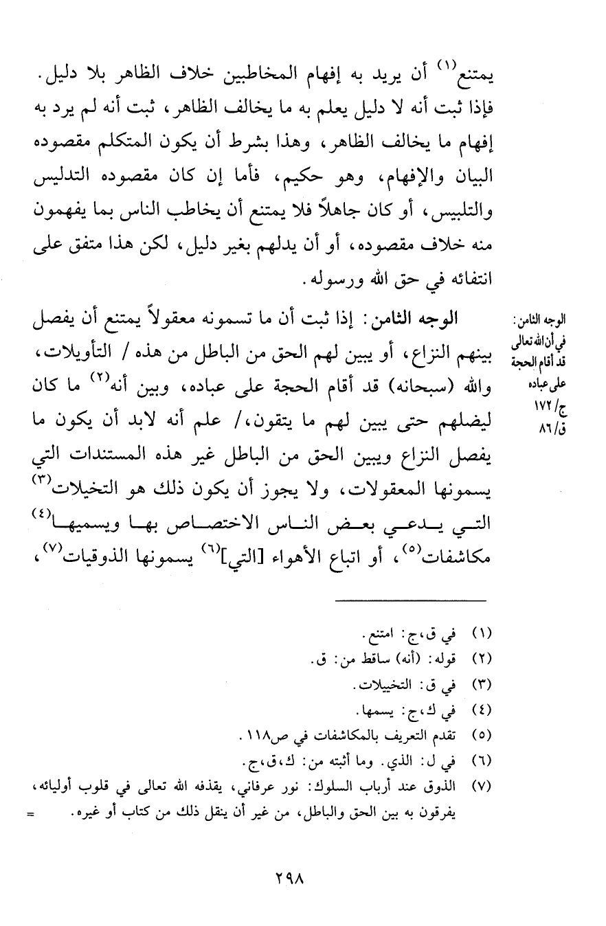 يمتنع أن يريد به إفهام المخاطبين خلاف الظاهر بلا دليل فإذا ثبت أنه لا دليل يعلم به ما يخالف الظاهر وهذا بشرط أن يكون المتكلم مقصوده البيان والإفهام وهو حكيم فأما إن كان مقصوده التدليس والتلبيس أو كان جاهلاً فلا يمتنع أن يخاطب الناس بما يفهمون منه خلاف مقصوده أو أن يدلهم بغير دليل لكن هذا متفق على انتفائه في حق الله ورسوله الوجه الثامن إذا ثبت أن ما تسمونه معقولاً يمتنع أن يفصل بينهم النزاع أو يبين لهم الحق من الباطل من هذه التأويلات والله سبحانه قد أقام الحجة على عباده وبين أنه ما كان ليضلهم حتى يبين لهم ما يتقون علم أنه لابد أن يكون ما يفصل النزاع ويبين الحق من الباطل غير هذه المستندات التي يسمونها المعقولات ولا يجوز أن يكون ذلك هو التخيلات التي يدعي بعض الناس الاختصاص بها ويسميها مكاشفات أو اتباع الأهواء التي يسمونها الذوقيات