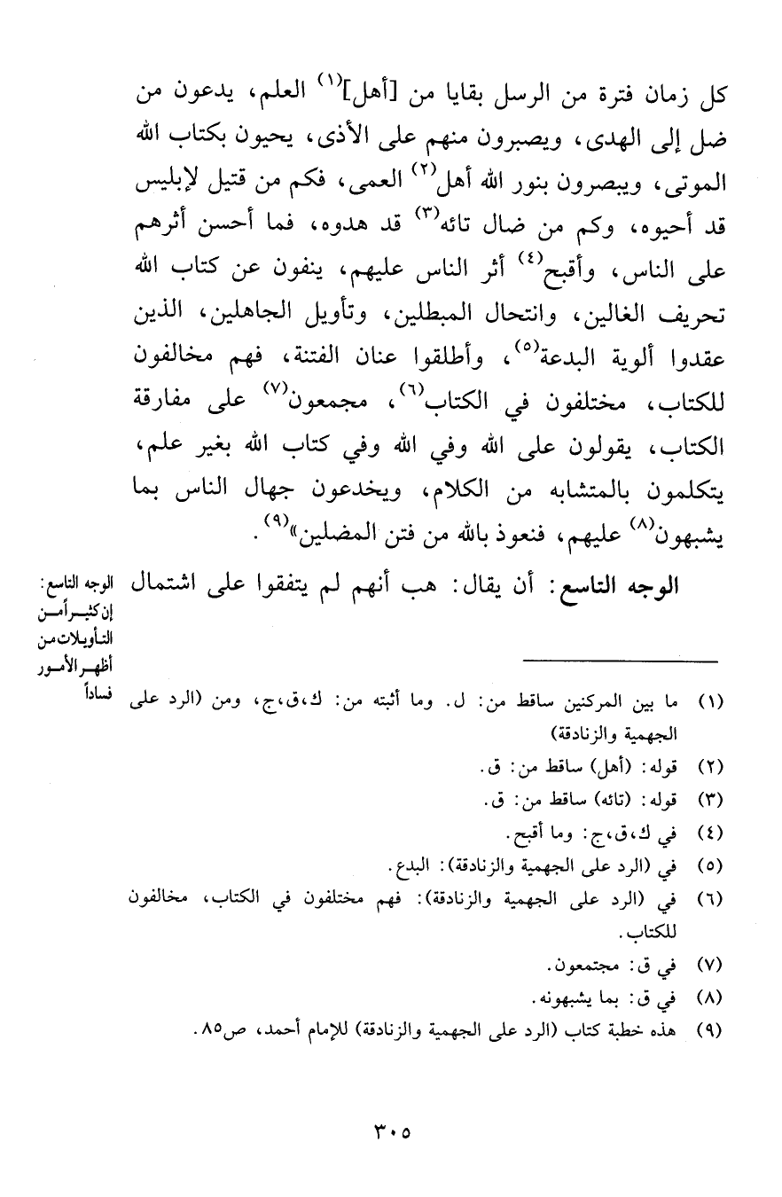 كل زمان فترة من الرسل بقايا من أهل العلم يدعون من ضل إلى الهدى ويصبرون منهم على الأذى يحيون بكتاب الله الموتى ويبصرون بنور الله أهل العمى فكم من قتيل لإبليس قد أحيوه وكم من ضال تائه قد هدوه فما أحسن أثرهم على الناس وأقبح أثر الناس عليهم ينفون عن كتاب الله تحريف الغالين وانتحال المبطلين وتأويل الجاهلين الذين عقدوا ألوية البدعة وأطلقوا عنان الفتنة فهم مخالفون للكتاب مختلفون في الكتاب مجمعون على مفارقة الكتاب يقولون على الله وفي الله وفي كتاب الله بغير علم يتكلمون بالمتشابه من الكلام ويخدعون جهال الناس بما يشبهون عليهم فنعوذ بالله من فتن المضلين الوجه التاسع أن يقال هب أنهم لم يتفقوا على اشتمال