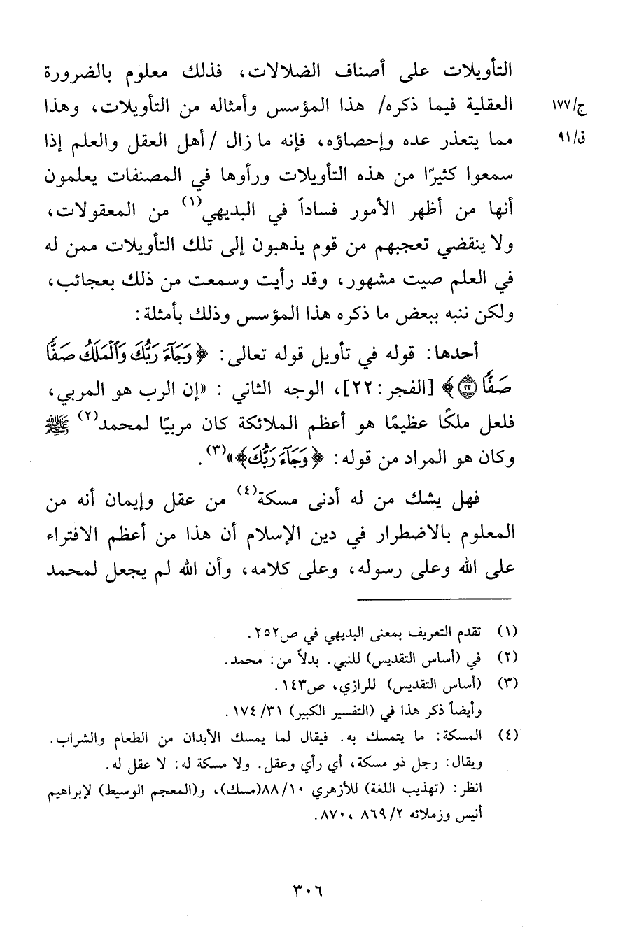 التأويلات على أصناف الضلالات فذلك معلوم بالضرورة العقلية فيما ذكره هذا المؤسس وأمثاله من التأويلات وهذا مما يتعذر عده وإحصاؤه فإنه ما زال أهل العقل والعلم إذا سمعوا كثيرًا من هذه التأويلات ورأوها في المصنفات يعلمون أنها من أظهر الأمور فسادًا في البديهي من المعقولات ولا ينقضي تعجبهم من قوم يذهبون إلى تلك التأويلات ممن له في العلم صيت مشهور وقد رأيت وسمعت من ذلك بعجائب ولكن ننبه ببعض ما ذكره هذا المؤسس وذلك بأمثلة أحدها قوله في تأويل قوله تعالى وَجَاءَ رَبُّكَ وَالْمَلَكُ صَفًّا صَفًّا (22) [الفجر 22] الوجه الثاني إن الرب هو المربي فلعل ملكًا عظيمًا هو أعظم الملائكة كان مربيًا لمحمد صلى الله عليه وسلم وكان هو المراد من قوله وَجَاءَ رَبُّكَ فهل يشك من له أدنى مسكة من عقل إيمان أنه من المعلوم بالاضطرار في دين الإسلام أن هذا من أعظم الافتراء على الله وعلى رسوله وعلى كلامه وأن الله لم يجعل لمحمد