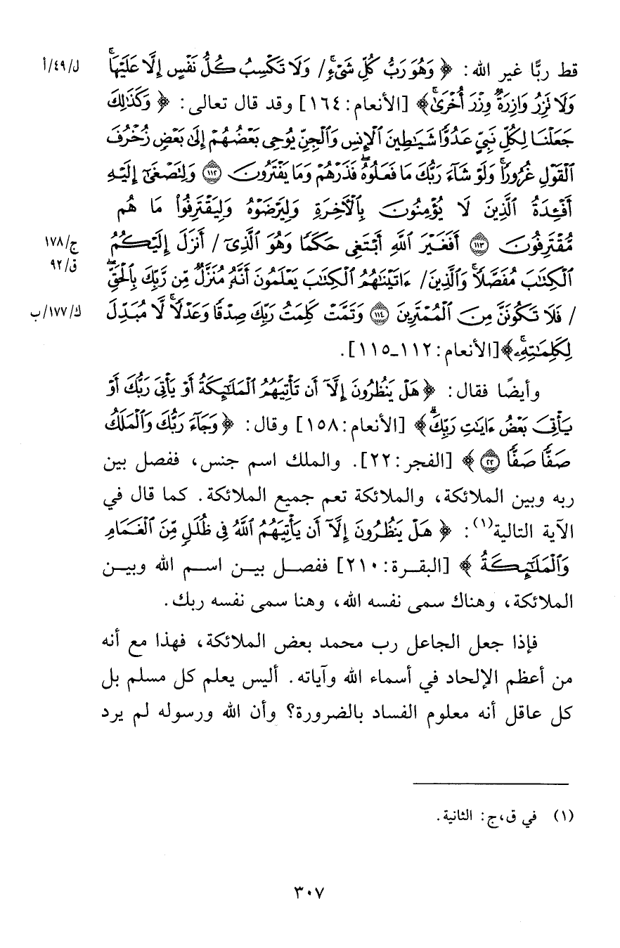 قط ربًّا غير الله وَهُوَ رَبُّ كُلِّ شَيْءٍ وَلَا تَكْسِبُ كُلُّ نَفْسٍ إِلَّا عَلَيْهَا وَلَا تَزِرُ وَازِرَةٌ وِزْرَ أُخْرَى [الأنعام 164] وقد قال تعالى وَكَذَلِكَ جَعَلْنَا لِكُلِّ نَبِيٍّ عَدُوًّا شَيَاطِينَ الْإِنْسِ وَالْجِنِّ يُوحِي بَعْضُهُمْ إِلَى بَعْضٍ زُخْرُفَ الْقَوْلِ غُرُورًا وَلَوْ شَاءَ رَبُّكَ مَا فَعَلُوهُ فَذَرْهُمْ وَمَا يَفْتَرُونَ (112) وَلِتَصْغَى إِلَيْهِ أَفْئِدَةُ الَّذِينَ لَا يُؤْمِنُونَ بِالْآخِرَةِ وَلِيَرْضَوْهُ وَلِيَقْتَرِفُوا مَا هُمْ مُقْتَرِفُونَ (113) أَفَغَيْرَ اللَّهِ أَبْتَغِي حَكَمًا وَهُوَ الَّذِي أَنْزَلَ إِلَيْكُمُ الْكِتَابَ مُفَصَّلًا وَالَّذِينَ آتَيْنَاهُمُ الْكِتَابَ يَعْلَمُونَ أَنَّهُ مُنَزَّلٌ مِنْ رَبِّكَ بِالْحَقِّ فَلَا تَكُونَنَّ مِنَ الْمُمْتَرِينَ (114) وَتَمَّتْ كَلِمَتُ رَبِّكَ صِدْقًا وَعَدْلًا لَا مُبَدِّلَ لِكَلِمَاتِهِ [الأنعام 112-115] وأيضًا فقال هَلْ يَنْظُرُونَ إِلَّا أَنْ تَأْتِيَهُمُ الْمَلَائِكَةُ أَوْ يَأْتِيَ رَبُّكَ أَوْ يَأْتِيَ بَعْضُ آيَاتِ رَبِّكَ [الأنعام 158] وقال وَجَاءَ رَبُّكَ وَالْمَلَكُ صَفًّا صَفًّا (22) [الفجر 22] والملك اسم جنس ففصل بين ربه وبين الملائكة والملائكة تعم جميع الملائكة كما قال في الآية التالية هَلْ يَنْظُرُونَ إِلَّا أَنْ يَأْتِيَهُمُ اللَّهُ فِي ظُلَلٍ مِنَ الْغَمَامِ وَالْمَلَائِكَةُ [البقرة 210] ففصل بين اسم الله وبين الملائكة وهناك سمى نفسه الله وهنا سمى نفسه ربك فإذا جعل الجاعل رب محمد بعض الملائكة فهذا مع أنه من أعظم الإلحاد في أسماء الله وآياته أليس يعلم كل مسلم بل كل عاقل أنه معلوم الفساد بالضرورة وأن الله ورسوله لم يرد