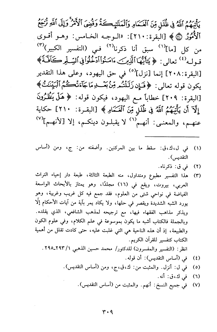 يَأْتِيَهُمُ اللَّهُ فِي ظُلَلٍ مِنَ الْغَمَامِ وَالْمَلَائِكَةُ وَقُضِيَ الْأَمْرُ وَإِلَى اللَّهِ تُرْجَعُ الْأُمُورُ (210) [البقرة 210] الوجه الخامس وهو أقوى من كل ما سبق أنا ذكرنا في التفسير الكبير قوله تعالى يَا أَيُّهَا الَّذِينَ آمَنُوا ادْخُلُوا فِي السِّلْمِ كَافَّةً [البقرة 208] إنما نزل في حق اليهود وعلى هذا التقدير يكون قوله تعالى فَإِنْ زَلَلْتُمْ مِنْ بَعْدِ مَا جَاءَتْكُمُ الْبَيِّنَاتُ [البقرة 209] خطاباً مع اليهود فيكون قوله هَلْ يَنْظُرُونَ إِلَّا أَنْ يَأْتِيَهُمُ اللَّهُ فِي ظُلَلٍ مِنَ الْغَمَامِ [البقرة 210] حكاية عنهم والمعنى أنهم لا يقبلون دينكم إلا لأنهم