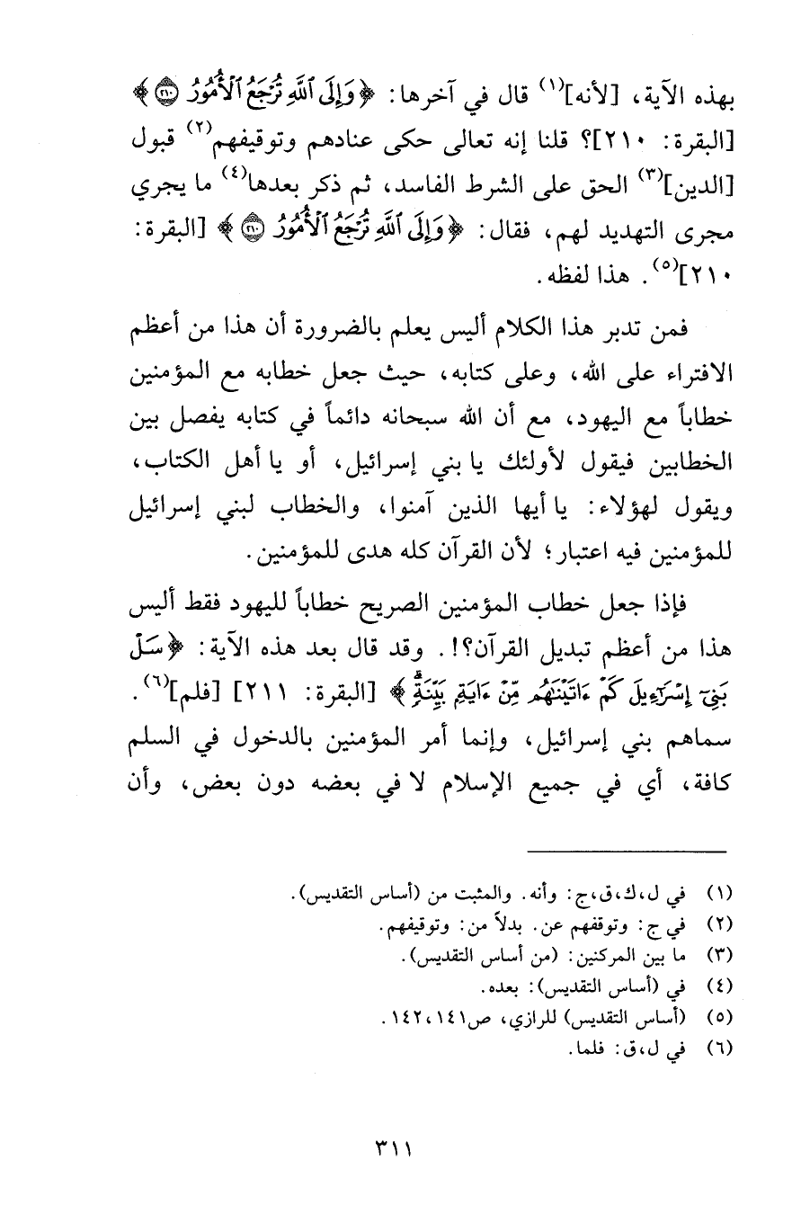 بهذه الآية لأنه قال في آخرها وَإِلَى اللَّهِ تُرْجَعُ الْأُمُورُ (210) [البقرة 210] هذا لفظه فمن تدبر هذا الكلام أليس يعلم بالضرورة أن هذا من أعظم الافتراء على الله وعلى كتابه حيث جعل خطابه مع المؤمنين خطاباً مع اليهود مع أن الله سبحانه دائماً في كتابه يفصل بين الخطابين فيقول لأولئك يا بني إسرائيل أو يا أهل الكتاب ويقول لهؤلاء يا أيها الذين آمنوا والخطاب لبني إسرائيل للمؤمنين فيه اعتبار لأن القرآن كله هدى للمؤمنين فإذا جعل خطاب المؤمنين الصريح خطاباً لليهود فقط أليس هذا من أعظم تبديل القرآن وقد قال بعد هذه الآية سَلْ بَنِي إِسْرَائِيلَ كَمْ آتَيْنَاهُمْ مِنْ آيَةٍ بَيِّنَةٍ [البقرة 211] فلم سماهم بني إسرائيل وإنما أمر المؤمنين بالدخول في السلم كافة أي في جميع الإسلام لا في بعضه دون بعض وأن
