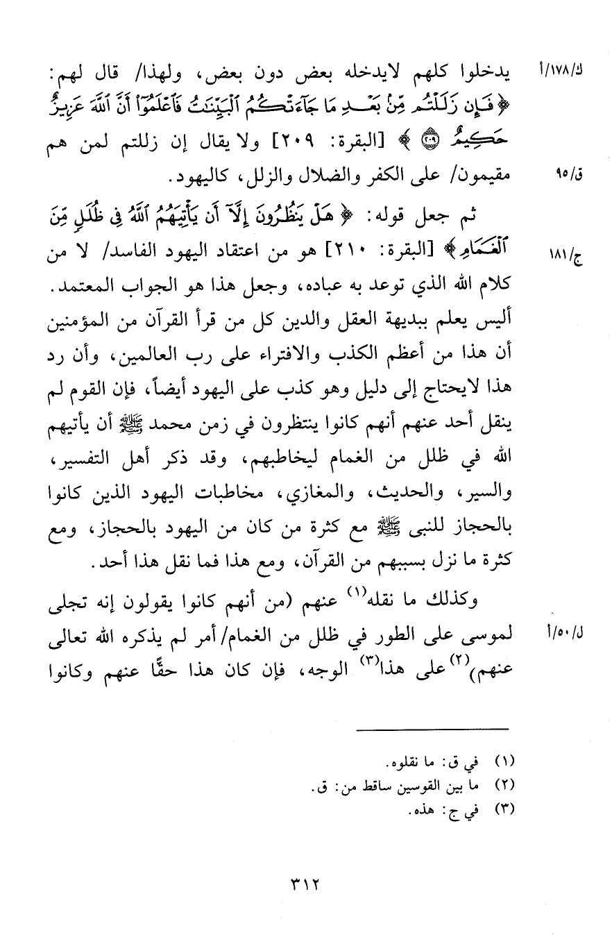 يدخلوا كلهم لا يدخله بعض دون بعض ولهذا قال لهم فَإِنْ زَلَلْتُمْ مِنْ بَعْدِ مَا جَاءَتْكُمُ الْبَيِّنَاتُ فَاعْلَمُوا أَنَّ اللَّهَ عَزِيزٌ حَكِيمٌ (209) [البقرة 209] ولا يقال لهم إن زللتم لمن هم مقيمون على الكفر والضلال والزلل كاليهود ثم جعل قوله هَلْ يَنْظُرُونَ إِلَّا أَنْ يَأْتِيَهُمُ اللَّهُ فِي ظُلَلٍ مِنَ الْغَمَامِ [البقرة 210] هو من اعتقاد اليهود الفاسد لا من كلام الله الذي توعد به عباده وجعل هذا هو الجواب المعتمد أليس يعلم ببديهة العقل والدين كل من قرأ القرآن من المؤمنين أن هذا من أعظم الكذب والافتراء على رب العالمين وأن رد هذا لا يحتاج إلى دليل وهو كذب على اليهود أيضاً فإن القوم لم ينقل أحد عنهم أنهم كانوا ينتظرون في زمن محمد صلى الله عليه وسلم أن يأتيهم الله في ظلل من الغمام ليخاطبهم وقد ذكر أهل التفسير والسير والحديث والمغازي مخاطبات اليهود الذين كانوا بالحجاز للنبي صلى الله عليه وسلم مع كثرة من كان من اليهود بالحجاز ومع كثرة ما نزل بسببهم من القرآن ومع هذا فما نقل هذا أحد وكذلك ما نقله عنهم من أنهم كانوا يقولون إنه تجلى لموسى على الطور في ظلل من الغمام أمر لم يذكره الله تعالى عنهم على هذا الوجه فإن كان هذا حقًّا عنهم وكانوا
