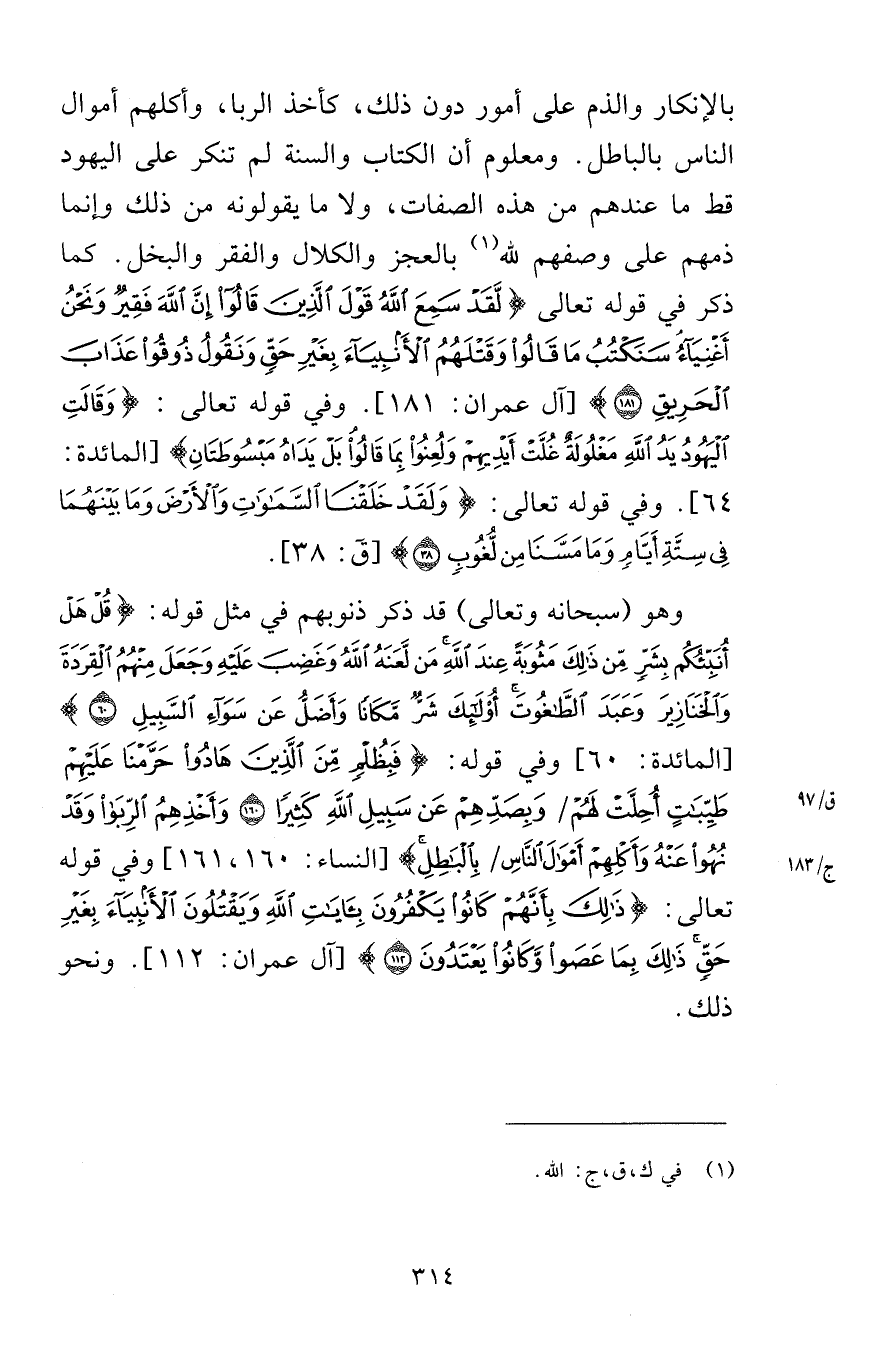 بالإنكار والذم على أمور دون ذلك كأخذ الربا وأكلهم أموال الناس بالباطل ومعلوم أن الكتاب والسنة لم تنكر على اليهود قط ما عندهم من هذه الصفات ولا ما يقولونه من ذلك وإنما ذمهم على وصفهم الله بالعجز والكلال والفقر والبخل كما ذكر في قوله تعالى لَقَدْ سَمِعَ اللَّهُ قَوْلَ الَّذِينَ قَالُوا إِنَّ اللَّهَ فَقِيرٌ وَنَحْنُ أَغْنِيَاءُ سَنَكْتُبُ مَا قَالُوا وَقَتْلَهُمُ الْأَنْبِيَاءَ بِغَيْرِ حَقٍّ وَنَقُولُ ذُوقُوا عَذَابَ الْحَرِيقِ (181) [آل عمران 181] وفي قوله تعالى وَقَالَتِ الْيَهُودُ يَدُ اللَّهِ مَغْلُولَةٌ غُلَّتْ أَيْدِيهِمْ وَلُعِنُوا بِمَا قَالُوا بَلْ يَدَاهُ مَبْسُوطَتَانِ [المائدة 64] وفي قوله تعالى وَلَقَدْ خَلَقْنَا السَّمَاوَاتِ وَالْأَرْضَ وَمَا بَيْنَهُمَا فِي سِتَّةِ أَيَّامٍ وَمَا مَسَّنَا مِنْ لُغُوبٍ (38) [ق 38] وهو سبحانه وتعالى قد ذكر ذنوبهم في مثل قوله قُلْ هَلْ أُنَبِّئُكُمْ بِشَرٍّ مِنْ ذَلِكَ مَثُوبَةً عِنْدَ اللَّهِ مَنْ لَعَنَهُ اللَّهُ وَغَضِبَ عَلَيْهِ وَجَعَلَ مِنْهُمُ الْقِرَدَةَ وَالْخَنَازِيرَ وَعَبَدَ الطَّاغُوتَ أُولَئِكَ شَرٌّ مَكَانًا وَأَضَلُّ عَنْ سَوَاءِ السَّبِيلِ (60) [المائدة 60] وفي قوله فَبِظُلْمٍ مِنَ الَّذِينَ هَادُوا حَرَّمْنَا عَلَيْهِمْ طَيِّبَاتٍ أُحِلَّتْ لَهُمْ وَبِصَدِّهِمْ عَنْ سَبِيلِ اللَّهِ كَثِيرًا (160) وَأَخْذِهِمُ الرِّبَا وَقَدْ نُهُوا عَنْهُ وَأَكْلِهِمْ أَمْوَالَ النَّاسِ بِالْبَاطِلِ [النساء 160-161] وفي قوله تعالى ذَلِكَ بِأَنَّهُمْ كَانُوا يَكْفُرُونَ بِآيَاتِ اللَّهِ وَيَقْتُلُونَ الْأَنْبِيَاءَ بِغَيْرِ حَقٍّ ذَلِكَ بِمَا عَصَوْا وَكَانُوا يَعْتَدُونَ (112) [آل عمران 112] ونحو ذلك