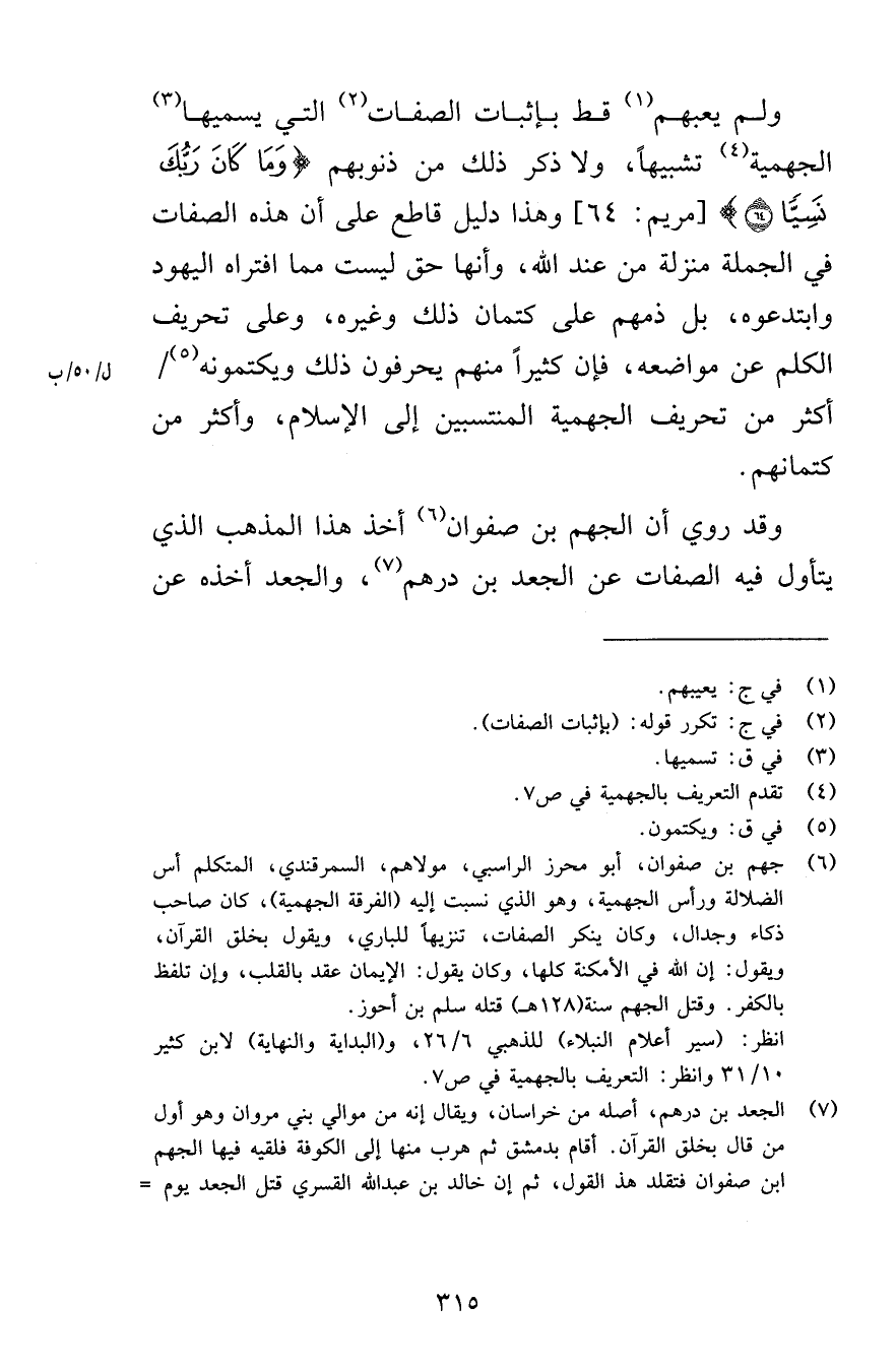 ولم يعبهم قط بإثبات الصفات التي يسميها الجهمية تشبيهاً ولا ذكر ذلك من ذنوبهم وَمَا كَانَ رَبُّكَ نَسِيًّا (64) [مريم 64] وهذا دليل قاطع على أن هذه الصفات في الجملة منزلة من عند الله وأنها حق ليست مما افتراه اليهود وابتدعوه بل ذمهم على كتمان ذلك وغيره وعلى تحريف الكلم عن مواضعه فإن كثيرًا منهم يحرفون ذلك ويكتمونه أكثر من تحريف الجهمية المنتسبين إلى الإسلام وأكثر من كتمانهم وقد روي أن الجهم بن صفوان أخذ هذا المذهب الذي يتأول فيه الصفات عن الجعد بن درهم والجعد أخذه عن