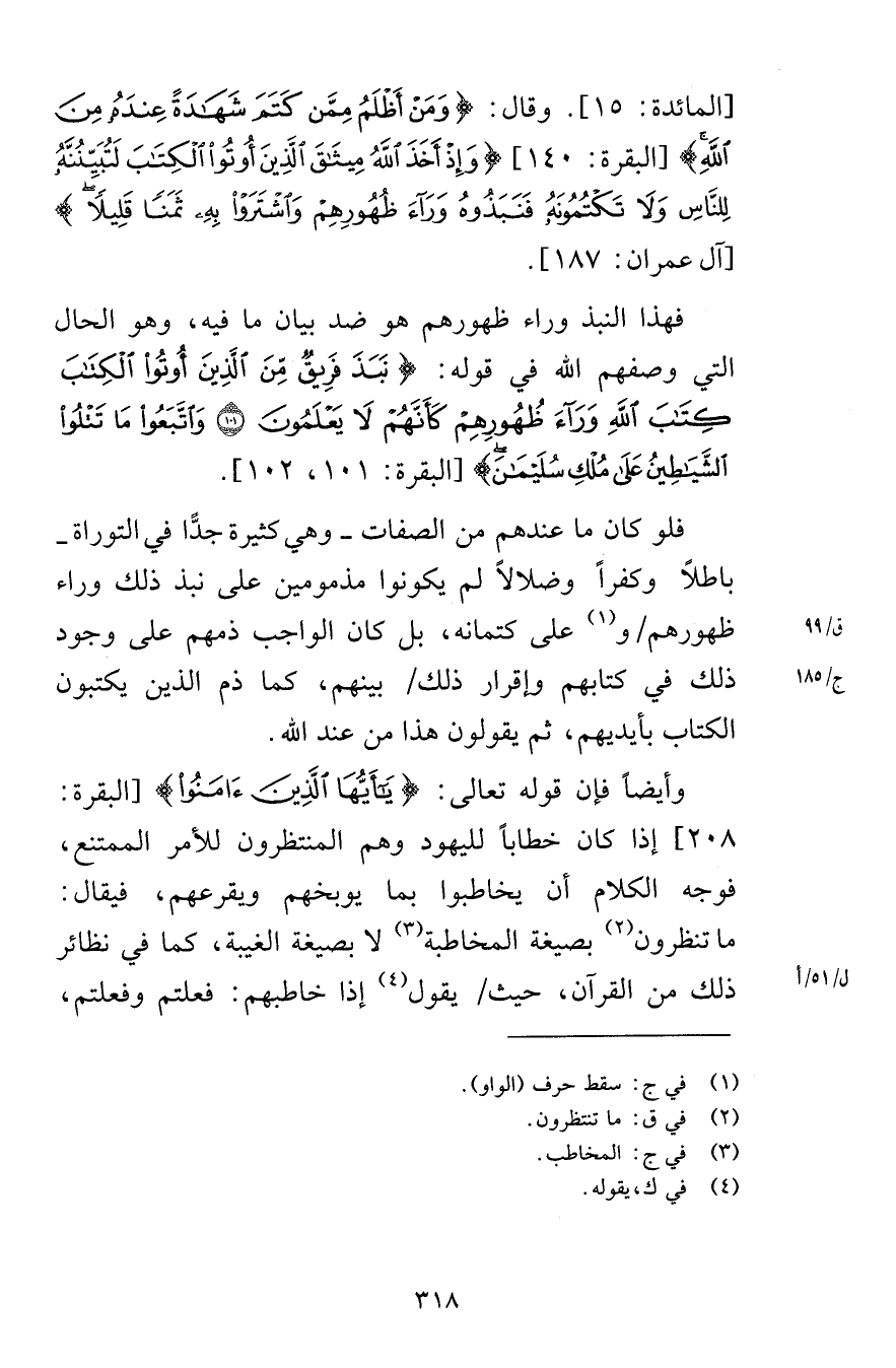 [المائدة 15] وقال وَمَنْ أَظْلَمُ مِمَّنْ كَتَمَ شَهَادَةً عِنْدَهُ مِنَ اللَّهِ [البقرة 140] وَإِذْ أَخَذَ اللَّهُ مِيثَاقَ الَّذِينَ أُوتُوا الْكِتَابَ لَتُبَيِّنُنَّهُ لِلنَّاسِ وَلَا تَكْتُمُونَهُ فَنَبَذُوهُ وَرَاءَ ظُهُورِهِمْ وَاشْتَرَوْا بِهِ ثَمَنًا قَلِيلًا [آل عمران 187] فهذا النبذ وراء ظهورهم هو ضد بيان ما فيه وهو الحال التي وصفهم الله في قوله نَبَذَ فَرِيقٌ مِنَ الَّذِينَ أُوتُوا الْكِتَابَ كِتَابَ اللَّهِ وَرَاءَ ظُهُورِهِمْ كَأَنَّهُمْ لَا يَعْلَمُونَ (101) وَاتَّبَعُوا مَا تَتْلُو الشَّيَاطِينُ عَلَى مُلْكِ سُلَيْمَانَ [البقرة 101-102] فلو كان ما عندهم من الصفات وهي كثيرة جدًّا في التوراة باطلاً وكفراً وضلالاً لم يكونوا مذمومين على نبذ ذلك وراء ظهورهم وعلى كتمانه بل كان الواجب ذمهم على وجود ذلك في كتابهم وإقرار ذلك بينهم كما ذم الذين يكتبون الكتاب بأيديهم ثم يقولون هذا من عند الله وأيضاً فإن قوله تعالى يَا أَيُّهَا الَّذِينَ آمَنُوا [البقرة 208] إذا كان خطاباً لليهود وهم المنتظرون للأمر الممتنع فوجه الكلام أن يخاطبوا بما يوبخهم ويقرعهم فيقول ما تنظرون بصيغة المخاطبة لا بصيغة الغيبة كما في نظائر ذلك من القرآن حيث يقول إذا خاطبهم فعلتم وفعلتم
