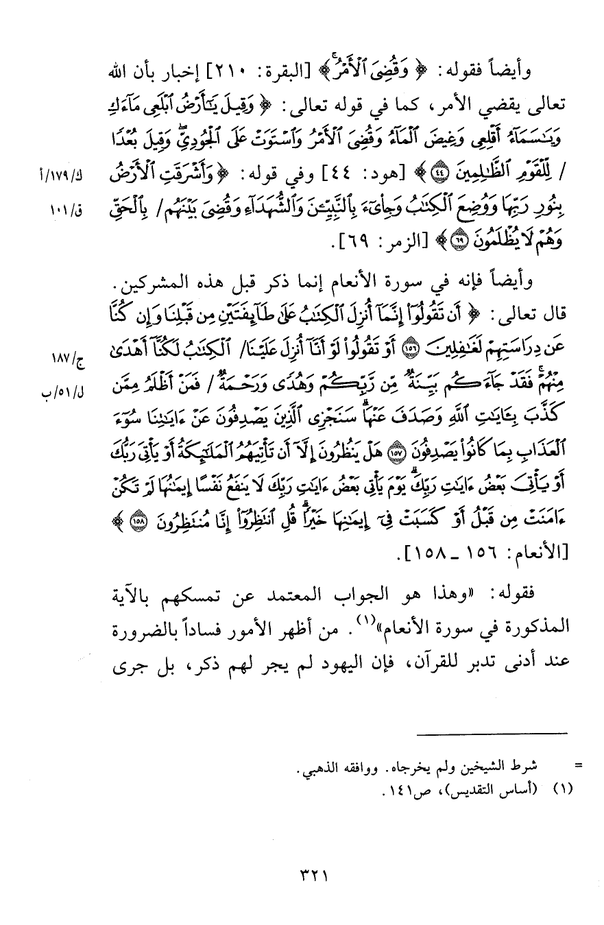 وأيضاً فقوله وَقُضِيَ الْأَمْرُ [البقرة 210] وإخبار بأن الله تعالى يقضي الأمر كما في قوله تعالى وَقِيلَ يَا أَرْضُ ابْلَعِي مَاءَكِ وَيَا سَمَاءُ أَقْلِعِي وَغِيضَ الْمَاءُ وَقُضِيَ الْأَمْرُ وَاسْتَوَتْ عَلَى الْجُودِيِّ وَقِيلَ بُعْدًا لِلْقَوْمِ الظَّالِمِينَ (44) [هود 44] وفي قوله وَأَشْرَقَتِ الْأَرْضُ بِنُورِ رَبِّهَا وَوُضِعَ الْكِتَابُ وَجِيءَ بِالنَّبِيِّينَ وَالشُّهَدَاءِ وَقُضِيَ بَيْنَهُمْ بِالْحَقِّ وَهُمْ لَا يُظْلَمُونَ (69) [الزمر 69] وأيضاً فإنه في سورة الأنعام إنما ذكر قبل هذه المشركين قال تعالى أَنْ تَقُولُوا إِنَّمَا أُنْزِلَ الْكِتَابُ عَلَى طَائِفَتَيْنِ مِنْ قَبْلِنَا وَإِنْ كُنَّا عَنْ دِرَاسَتِهِمْ لَغَافِلِينَ (156) أَوْ تَقُولُوا لَوْ أَنَّا أُنْزِلَ عَلَيْنَا الْكِتَابُ لَكُنَّا أَهْدَى مِنْهُمْ فَقَدْ جَاءَكُمْ بَيِّنَةٌ مِنْ رَبِّكُمْ وَهُدًى وَرَحْمَةٌ فَمَنْ أَظْلَمُ مِمَّنْ كَذَّبَ بِآيَاتِ اللَّهِ وَصَدَفَ عَنْهَا سَنَجْزِي الَّذِينَ يَصْدِفُونَ عَنْ آيَاتِنَا سُوءَ الْعَذَابِ بِمَا كَانُوا يَصْدِفُونَ (157) هَلْ يَنْظُرُونَ إِلَّا أَنْ تَأْتِيَهُمُ الْمَلَائِكَةُ أَوْ يَأْتِيَ رَبُّكَ أَوْ يَأْتِيَ بَعْضُ آيَاتِ رَبِّكَ يَوْمَ يَأْتِي بَعْضُ آيَاتِ رَبِّكَ لَا يَنْفَعُ نَفْسًا إِيمَانُهَا لَمْ تَكُنْ آمَنَتْ مِنْ قَبْلُ أَوْ كَسَبَتْ فِي إِيمَانِهَا خَيْرًا قُلِ انْتَظِرُوا إِنَّا مُنْتَظِرُونَ (158) [الأنعام 156-158] فقوله وهذا هو الجواب المعتمد عن تمسكهم بالآية المذكورة في سورة الأنعام من أظهر الأمور فساداً بالضرورة عند أدنى تدبر للقرآن فإن اليهود لم يجر لهم ذكر بل جرى