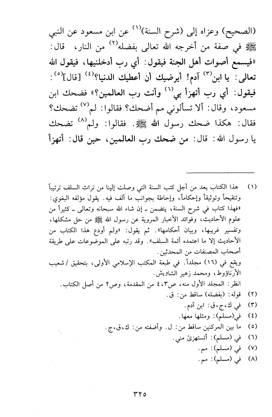 الصحيح وعزاه إلى شرح السنة عن ابن مسعود عن النبي صلى الله عليه وسلم في صفة من أخرجه الله تعالى بفضله من النار قال فيسمع أصوات أهل الجنة فيقول أي رب أدخلنيها فيقول الله تعالى يا ابن آدم أيرضيك أن أعطيك الدنيا قال فيقول أي رب أتهزأ بي وأنت رب العالمين فضحك ابن مسعود وقال ألا تسألوني مما أضحك فقالوا لم تضحك فقال هكذا ضحك رسول الله صلى الله عليه وسلم فقالوا ولم تضحك يا رسول الله قال من ضحك رب العالمين حين قال أتهزأ