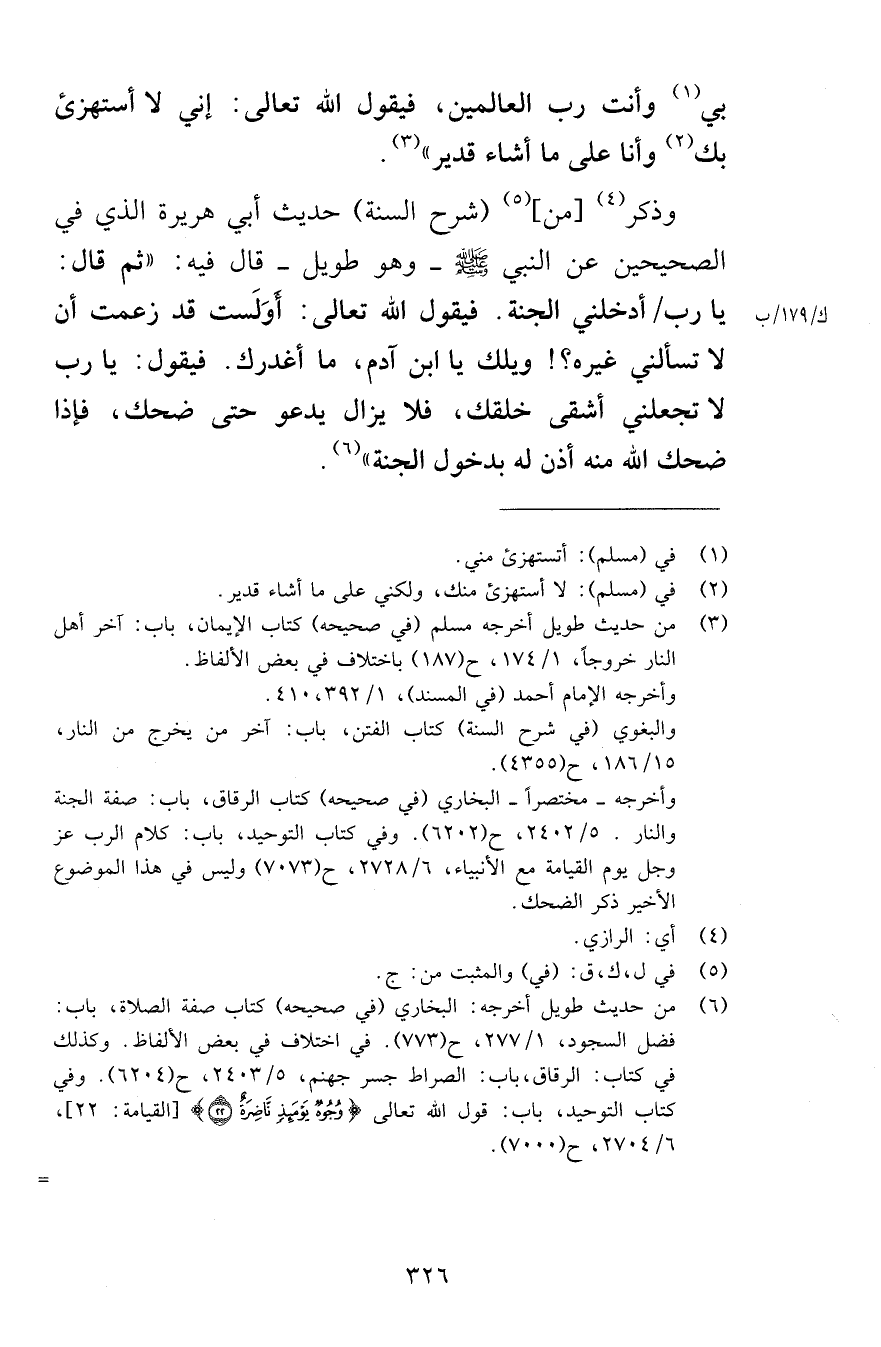 بي وأنت رب العالمين فيقول الله تعالى إني لا أستهزئ بك وأنا على ما أشاء قدير وذكر من شرح السنة حديث أبي هريرة الذي في الصحيحين عن النبي صلى الله عليه وسلم وه طويل قال فيه ثم قال يا رب أدخلني الجنة فيقول الله تعالى أَوَلَست قد زعمت أن لا تسألني غيره ويلك يا ابن آدم ما أغدرك فيقول يا رب لا تجعلني أشقى خلقك فلا يزال يدعو حتى ضحك فإذا ضحك الله منه أذن له بدخول الجنة