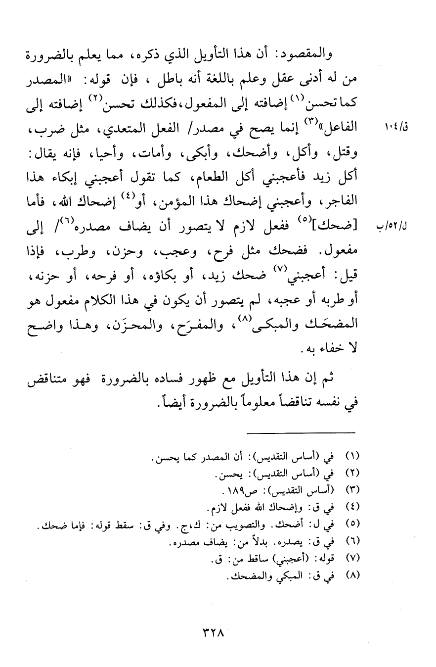 والمقصود أن هذا التأويل الذي ذكره مما يعلم بالضرورة من له أدنى عقل وعلم باللغة أنه باطل فإن قول المصدر كما تحسن إضافته إلى المفعول فكذلك تحسن إضافته إلى الفاعل إنما يصح في مصدر الفعل المتعدي مثل ضرب وقتل وأكل وأضحك وأبكى وأمات وأحيا فإنه يقال أكل زيد فأعجبني أكل الطعام كما تقول أعجبني إبكاء هذا الفاجر وأعجبني إضحاك هذا المؤمن أو إضحاك الله فأما ضحك ففعل لازم لا يتصور أن يضاف مصدره إلى مفعول فضحك مثل فرح وعجب وحزن وطرب فإذا قيل أعجبني ضحك زيد أو بكاؤه أو فرحه أو حزنه أو طربه أو عجبه لم يتصور أن يكون في هذا الكلام مفعول هو المضحَك المبكى والمفرَح والمحزَن وهذا واضح لا خفاء به ثم إن هذا التأويل مع ظهور فساده بالضرورة فهو متناقض في نفسه تناقضاً معلوماً بالضرورة أيضاً