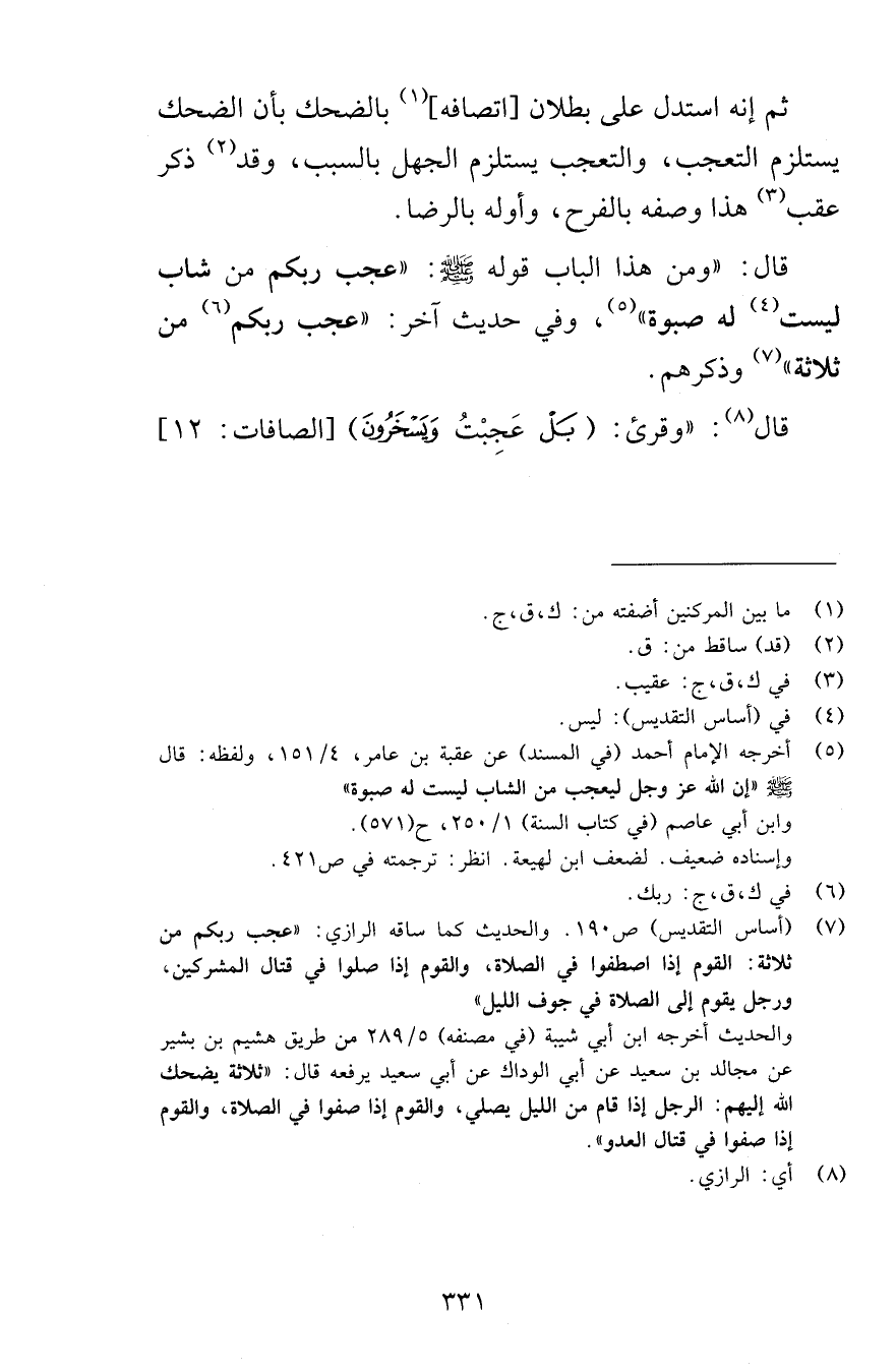 ثم إنه استدل على بطلان اتصافه بالضحك أن الضحك يستلزم التعجب والتعجب يستلزم الجهل بالسبب وقد ذكر عقب هذا وصفه بالفرح وأوله بالرضا قال ومن هذا الباب قوله صلى الله عليه وسلم عجب ربكم من شاب ليست له صبوة وفي حديث آخر عجب ربكم من ثلاثة وذكرهم قال وقرئ بَلْ عَجِبْتَ وَيَسْخَرُونَ (12) [الصافات 12]