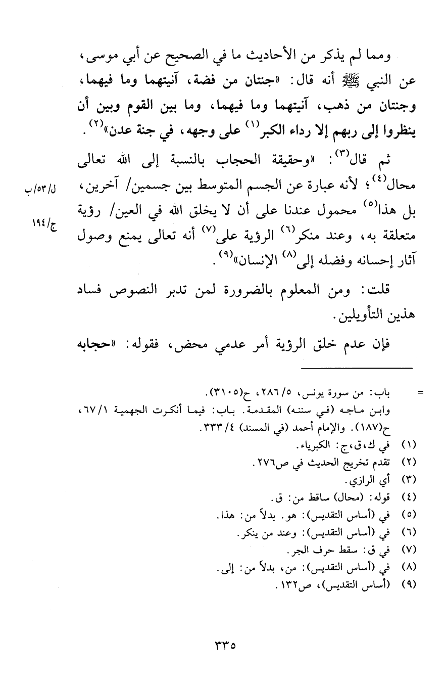 ومما لم يذكر من الأحاديث ما في الصحيح عن أبي موسى عن النبي صلى الله عليه وسلم أنه قال جنتان من فضة آنيتهما وما فيهما وجنتان من ذهب آنيتهما وما فيهما وما بين القوم وبين أن ينظروا إلى ربهم إلا رداء الكبر على وجهه في جنة عدن ثم قال وحقيقة الحجاب بالنسبة إلى الله تعالى محال لأنه عبارة عن الجسم المتوسط بين جسمين آخرين بل هذا محمول عندنا على أن لا يخلق الله في العين رؤية متعلقة به وعند منكر الرؤية على أنه تعالى يمنع وصول آثار إحسانه وفضله إلى الإنسان قلت ومن المعلوم بالضرورة لمن تدبر النصوص فساد هذين التأويلين فإن عدم خلق الرؤية أمر عدمي محض فقوله حجابه