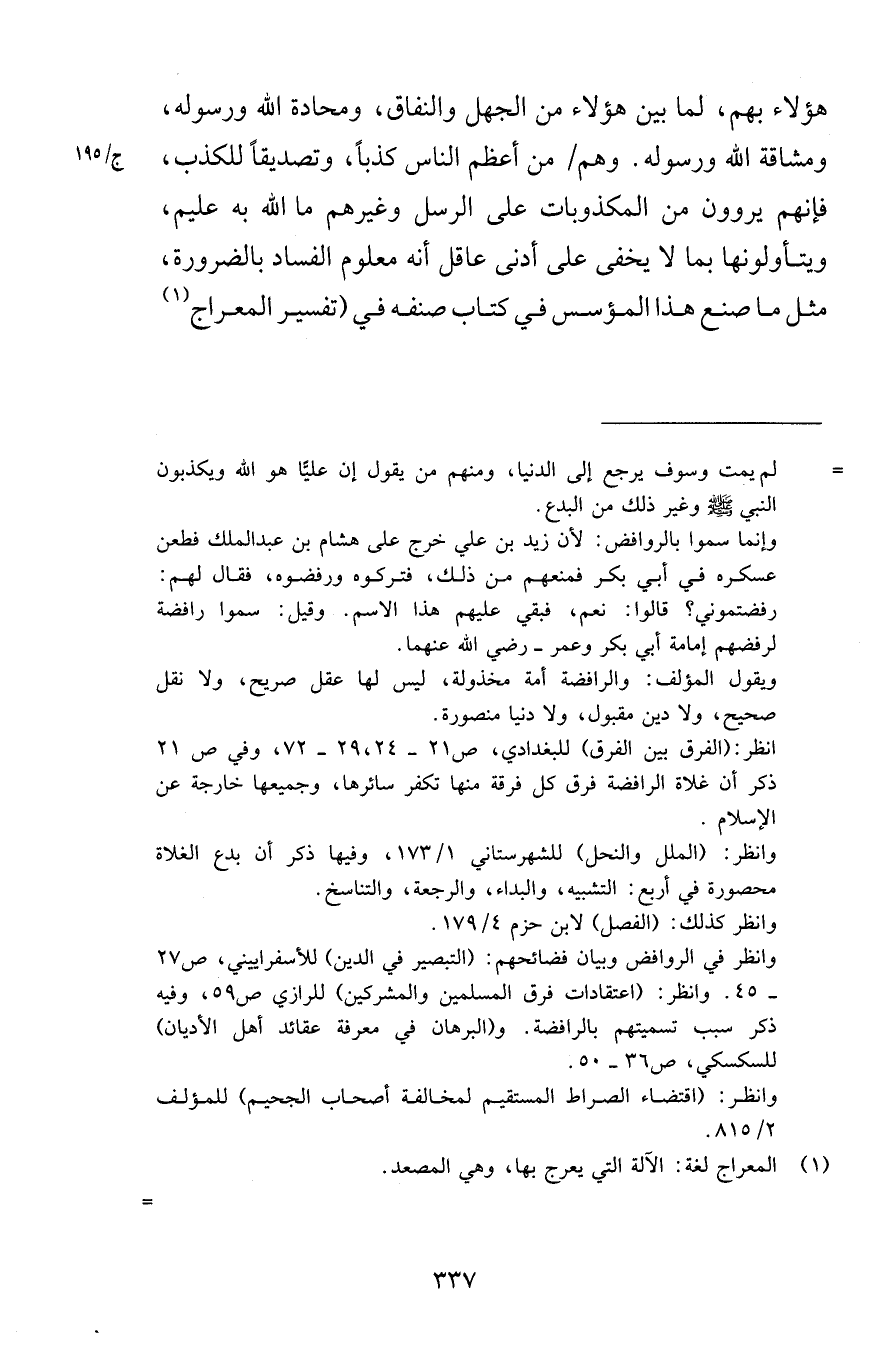 هؤلاء بهم لما بين هؤلاء من الجهل والنفاق ومحادة الله ورسوله ومشاقة الله ورسوله وهم من أعظم الناس كذباً وتصديقاً للكذب فإنهم يروون من المكذوبات على الرسل وغيرهم وما الله به عليم ويتأولونها بما لا يخفى على أدنى عاقل أنه معلوم الفساد بالضرورة مثل ما صنع هذا المؤسس في كتاب صنفه في تفسير المعراج