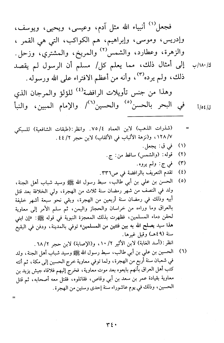 فجعل أنبياء الله مثل آدم وعيسى ويحيى ويوسف وإدريس وموسى وإبراهيم هم الكواكب التي هي القمر والزهرة وعطارد والشمس والمريخ والمشترى وزحل إلى أمثال ذلك مما يعلم كل مسلم أن الرسول لم يقصد ذلك ولم يرده وأنه من أعظم الافتراء على الله ورسوله وهذا من جنس تأويلات الرافضة للؤلؤ والمرجان الذي في البحر بالحسن والحسين والإمام المبين والنبأ