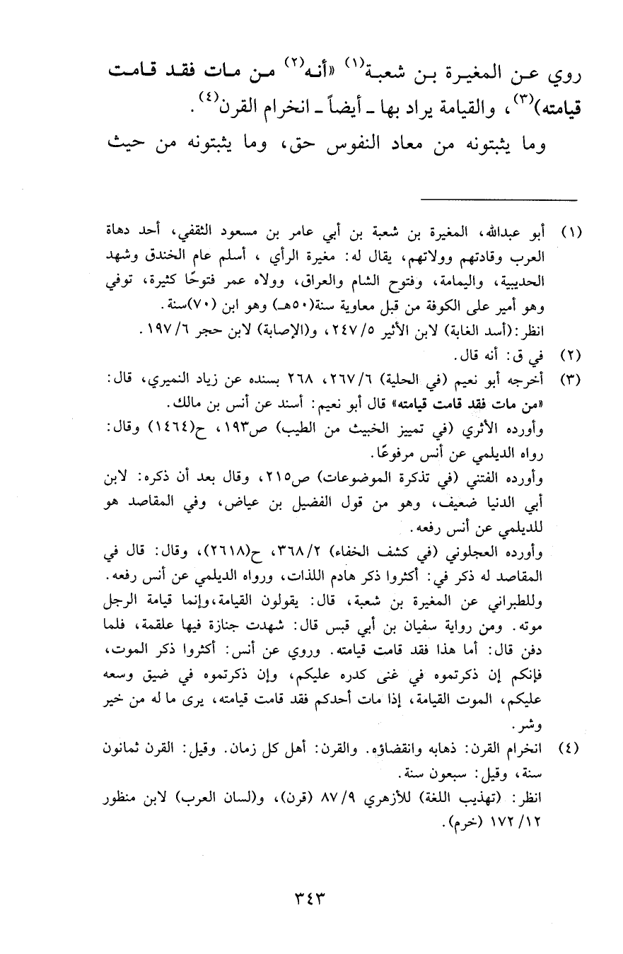 روي عن المغيرة بن شعبة أنه من مات فقد قامت قيامته والقيامة يراد بها انخرام القرن وما يثبتونه من معاد النفوس حق وما يثبتونه من حيث