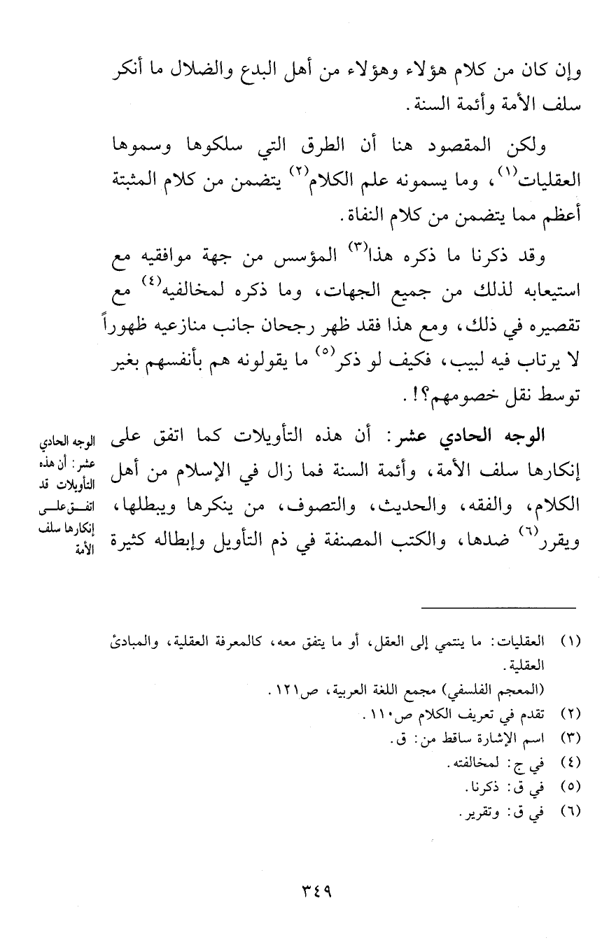 وإن كان من كلام هؤلاء وهؤلاء من أهل البدع والضلال ما أنكر سلف الأمة وأئمة السنة ولكن المقصود هنا أن الطرق التي سلكوها وسموها العقليات وما يسمونه علم الكلام يتضمن من كلام المثبتة أعظم مما يتضمن من كلام النفاة وقد ذكرنا ما ذكره هذا المؤسس من جهة موافقيه مع استيعابه لذلك من جميع الجهات وما ذكره لمخالفيه مع تقصيره في ذلك ومع هذا فقد ظهر رجحان جانب منازعيه ظهوراً لا يرتاب فيه لبيب فكيف لو ذكر ما يقولونه هم بأنفسهم بغير توسط نقل خصومهم الوجه الحادي عشر أن هذه التأويلات كما اتفق على إنكارها سلف الأمة وأئمة السنة فما زال في الإسلام من أهل الكلام والفقه والحديث والتصوف من ينكرها ويبطلها ويقرر ضدها والكتب المصنفة في ذم التأويل وإبطاله كثيرة