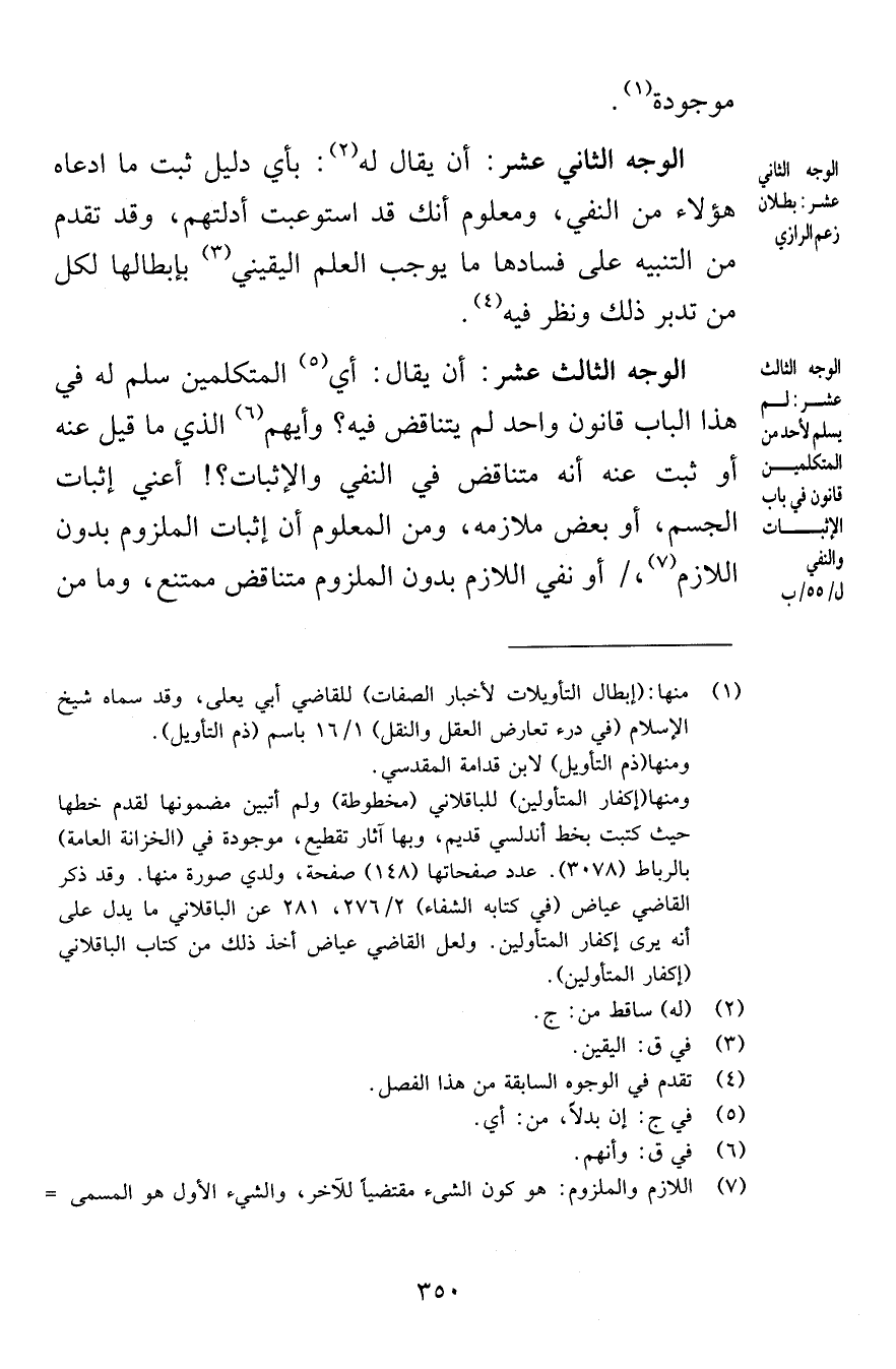 موجودة الوجه الثاني عشر أن يقال له بأي دليل ثبت ما ادعاه هؤلاء من النفي ومعلوم أنك قد استوعبت أدلتهم وقد تقدم من التنبيه على فسادها ما يوجب العلم اليقيني بإبطالها لكل من تدبر ذلك ونظر فيه الوجه الثالث عشر، يقال أي المتكلمين سلم له في هذا الباب قانون واحد لم يتناقض فيه وأيهم الذي ما قيل عنه أو ثبت عنه أنه متناقض في النفي والإثبات أعني إثبات الجسم أو بعض ملازمه ومن المعلوم أن إثبات الملزوم بدون اللازم أو نفي اللازم بدون الملزوم متناقض ممتنع وما من