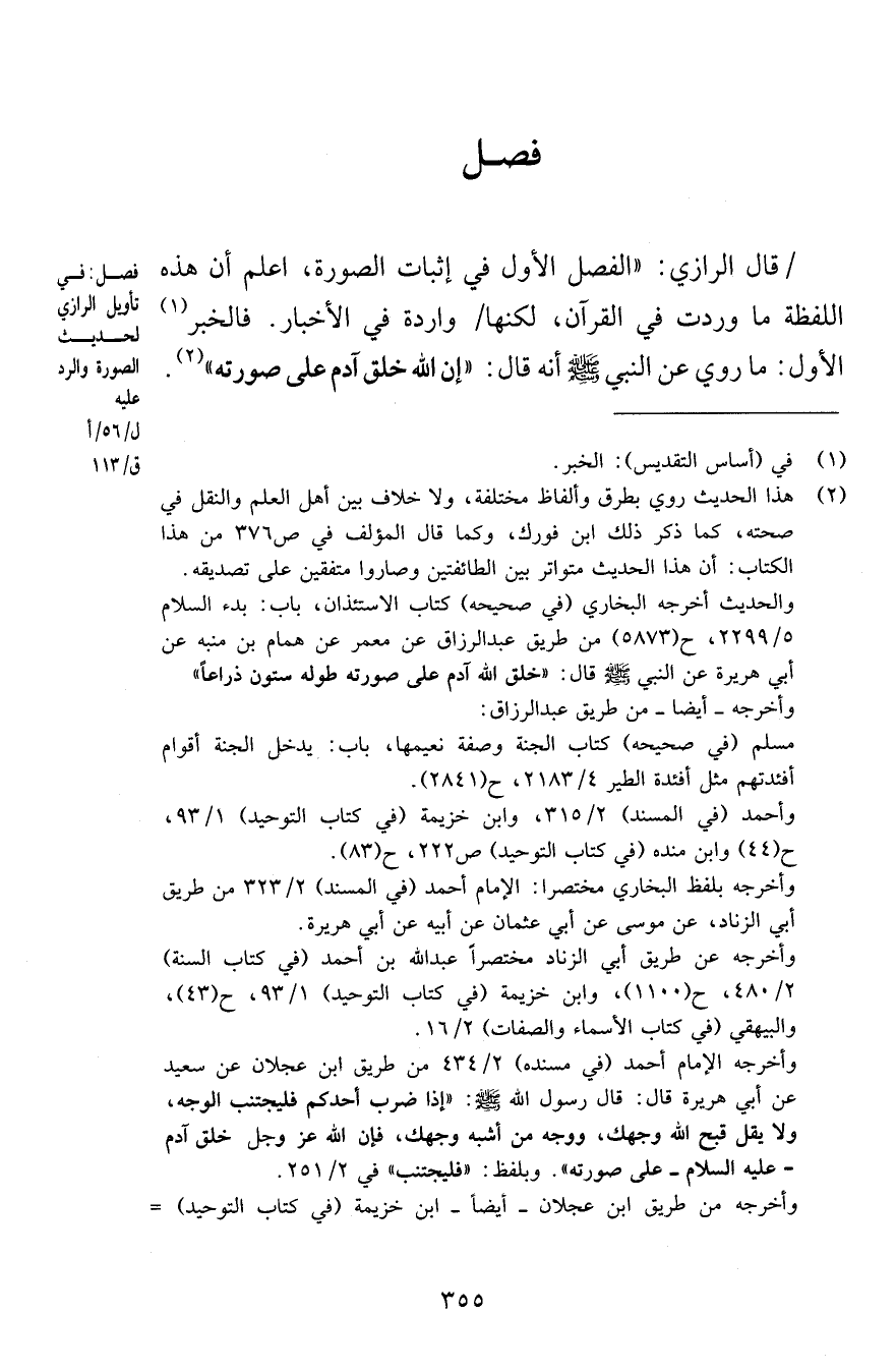 فصل قال الرازي الفصل الأول في إثبات الصورة اعلم أن هذه اللفظة ما وردت في القرآن لكنها واردة في الأخبار فالخبر الأول ما روي عن النبي صلى الله عليه وسلم أنه قال إن الله خلق آدم على صورته