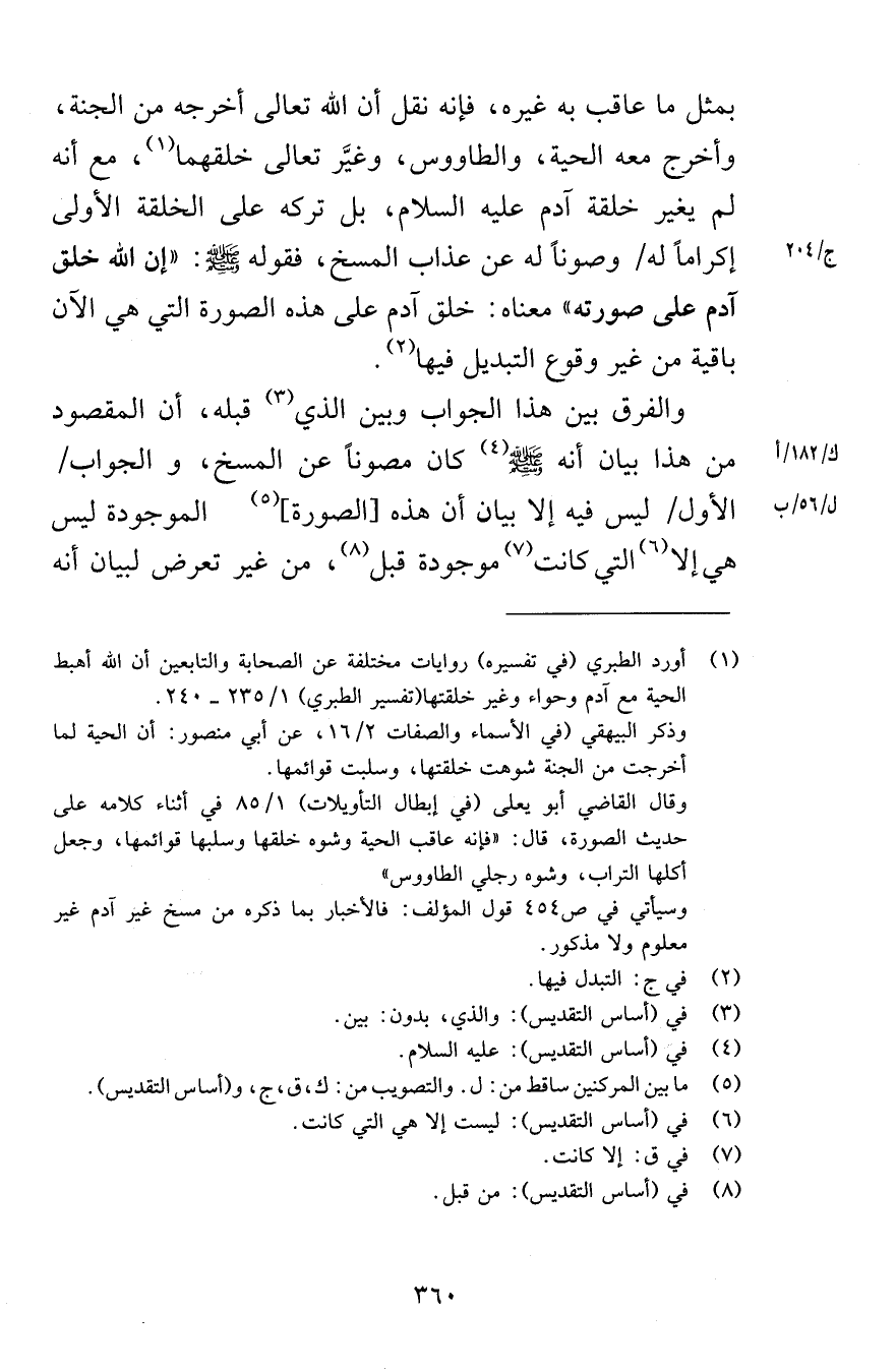 بمثل ما عاقب به غيره فإنه نقل أن الله تعالى أخرجه من الجنة وأخرج معه الحية والطاووس وغيَّر تعالى خلقهما مع، هـ لم يغير خلقة آدم عليه السلام بل تركه على الخلقة الأولى إكراماً له وصوناً له من عذاب المسخ فقوله صلى الله عليه وسلم عن الله خلق آدم على صورته معناه خلق آدم على هذه الصورة التي هي الآن باقية من غير وقوع التبديل فيها والفرق بين هذا الجواب وبين الذي قبله أن المقصود من هذا بيان أنه صلى الله عليه وسلم كان مصوناً عن المسخ والجواب الأول ليس فيه إلا بيان أن هذه الصورة الموجودة ليس هي إلا التي كانت موجودة قبل من غير تعرض لبيان أنه