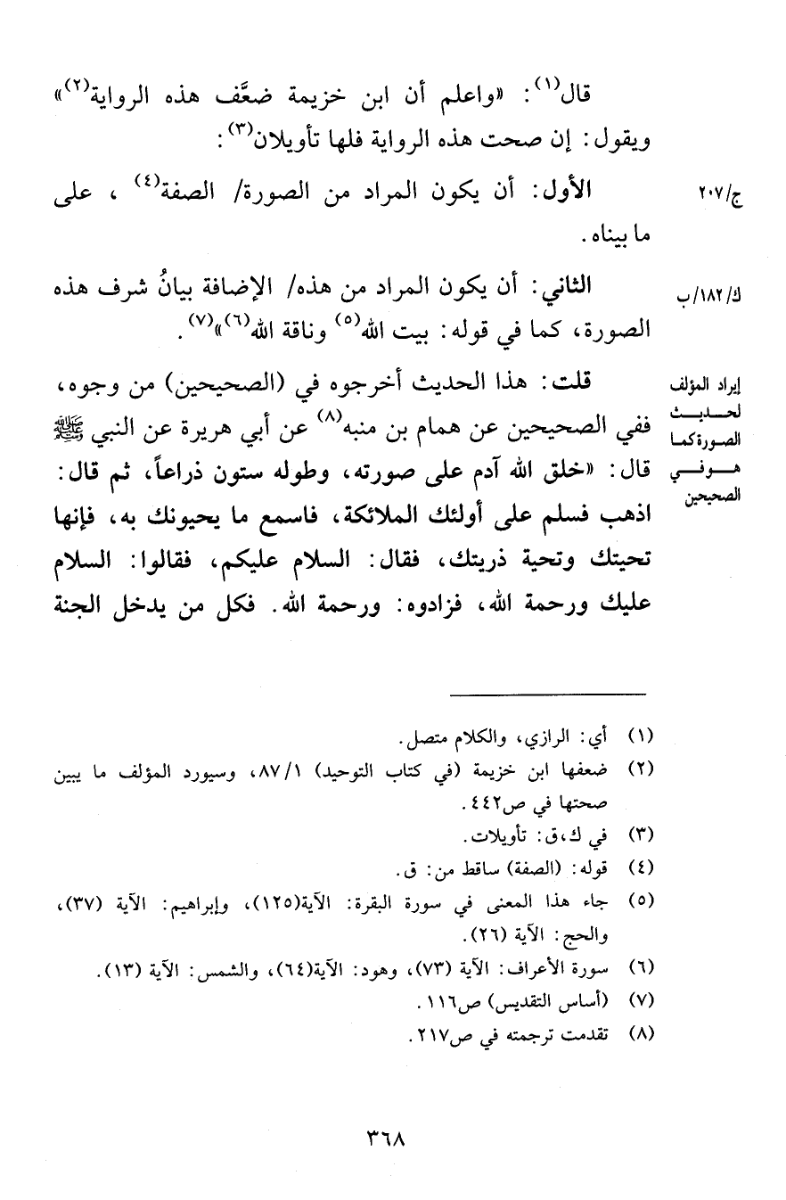 قال واعلم أن ابن خزيمة ضعَّف هذه الرواية ويقول إن صحت هذه الراوية فلها تأويلان الأول أن يكون المراد من الصورة الصفة على ما بيناه الثاني أن يكون المراد من هذه الإضافة بيانُ شرف هذه الصورة كما في قوله بيت الله وناقة الله قلت هذا الحديث أخرجوه في الصحيحين من وجوه ففي الصحيحين عن همام بن منبه عن أبي هريرة عن النبي صلى الله عليه وسلم قال خلق الله آدم على صورته وطوله ستون ذراعاً ثم قال اذهب فسلم على أولئك الملائكة فاسمع ما يحيون كبه فإنها تحيتك وتحية ذريتك فقال السلام عليكم فقالوا السلام عليك ورحمة الله فزادوه ورحمة الله فكل من يدخل الجنة