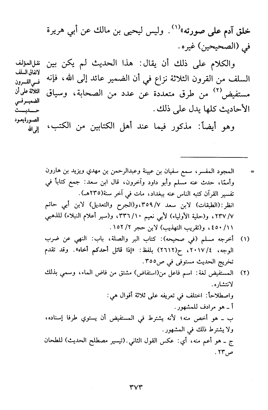 خلق آدم على صورته وليس ليحيى بن مالك عن أبي هريرة في الصحيحين غيره والكلام على ذلك أن يقال هذا الحديث لم يكن بين السلف من القرون الثلاثة نزاع في أن الضمير عائد إلى الله فإنه مستفيض من طرق متعددة عن عدد من الصحابة وسياق الأحاديث كلها يدل على ذلك وهو أيضاً مذكور فيما عند أهل الكتابين من الكتب