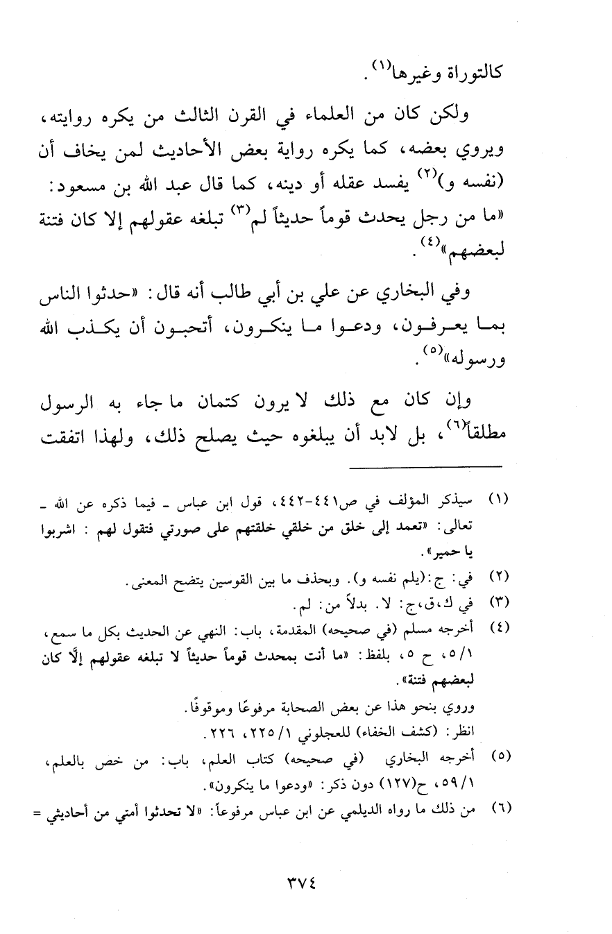 كالتوراة وغيرها ولكن كان من العلماء في القرن الثالث من يكره روايته ويروي بعضه كما يكره رواية لعض الأحاديث لمن يخاف أن نفسه ويفسد عقله أو دينه كما قال عبد الله بن مسعود ما من رجل يحدث قوماً حديثاً لم تبلغه عقولهم إلا كان فتنة لبعضهم وفي البخاري عن علي بن أبي طالب أنه قال حدثوا الناس بما يعرفون ودعوا ما ينكرون أتحبون أن يكذب الله ورسوله وإن كان مع ذلك لا يرون كتمان ما جاء به الرسول مطلقاً بل لابد أن يبلغوه حيث يصلح ذلك ولهذا اتفقت