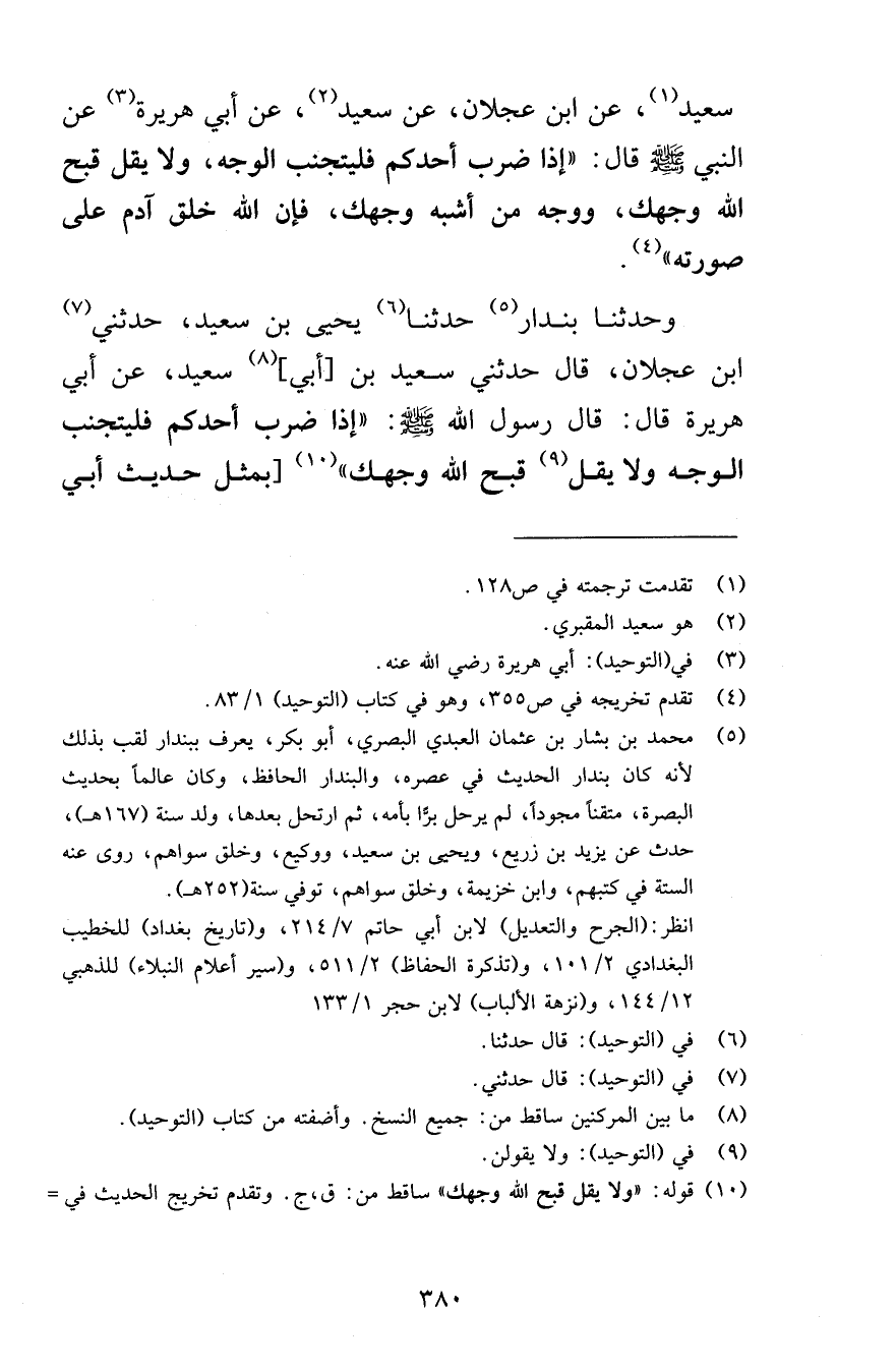 سعيد عن ابن عجلان عن سعيد عن أبي هريرة عن النبي صلى الله عليه وسلم قال إذا ضرب أحدكم فليتجنب الوجه ولا يقل قبح الله وجهك ووجه من أشبه وجهك فإن الله خلق آدم على صورته وحدثنا بندار حدثنا يحيى بن سعيد حدثني ابن عجلان قال حدثني سعيد بن أبي سعيد عن أبي هريرة قال قال رسول الله صلى الله عليه وسلم إذا ضرب أحدكم فليتجنب الوجه ولا يقل قبح الله وجهك بمثل حديث أبي