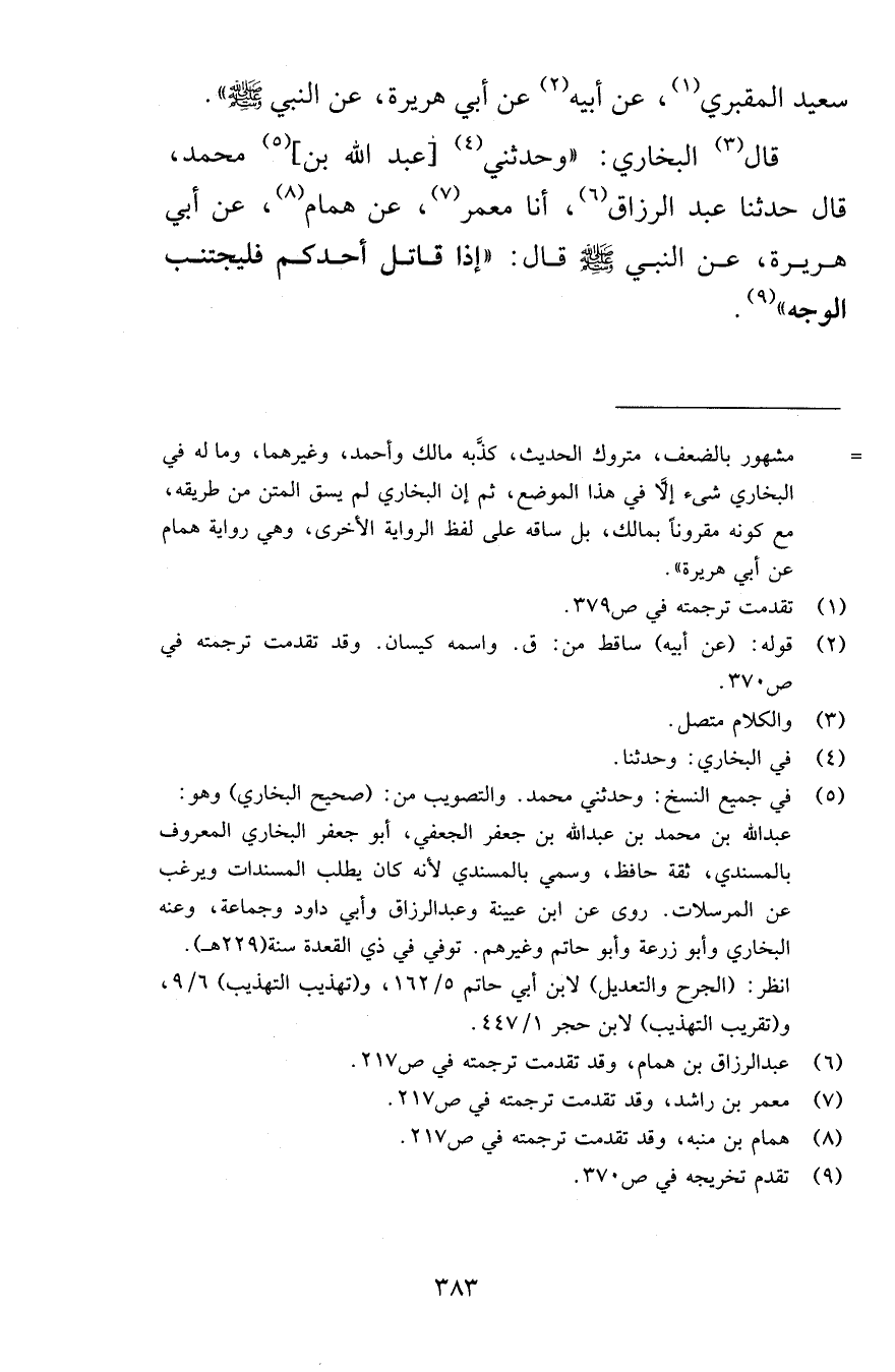 سعيد المقبري عن أبيه عن أبي هريرة عن النبي صلى الله عليه وسلم قال البخاري وحدثني عبد الله بن محمد قال حدثنا عبد الرزاق أنا معمر عن همام عن أبي هريرة عن النبي صلى الله عليه وسلم قال إذا قاتل أحدكم فليجتنب الوجه